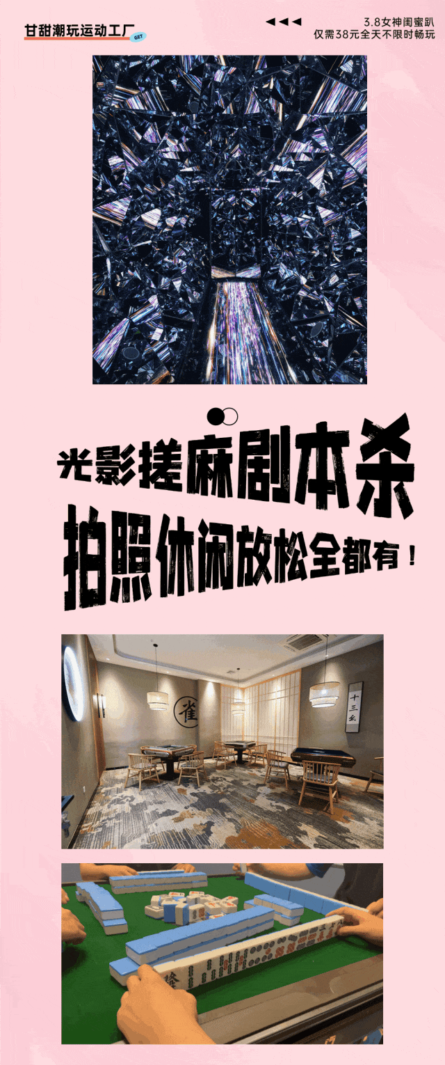 🌸约上闺蜜一起来潮玩馆打打麻将,玩玩剧本杀,打打奥运射击,光影馆拍拍照,打打CS,体验下VR,各种越野车/摩托疯狂解压,还有复古唱吧和跳格子