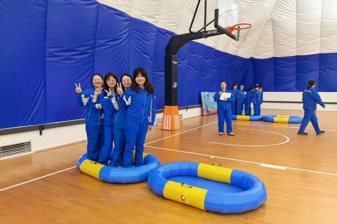本次趣味运动会设置了集趣味性、协作性和竞技性于一体的四个团体项目。在“神采飞扬”跳绳比赛中,选手们身轻如燕,彩绳飞舞;在“俄罗斯方块”项目中,大家默契配合,争分夺秒地拼图;“毛毛虫竞速”赛道上,队员们步伐一致地冲向终点;而“同舟共济”项目更是考验团队的协作能力,队员们需站在气垫船上,通过交替传递两只船、全员依次换乘的方式向前行进,直至抵达终点。