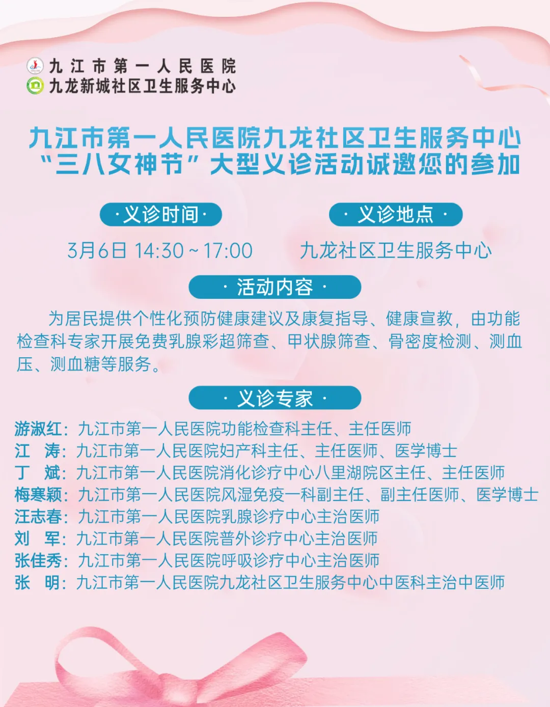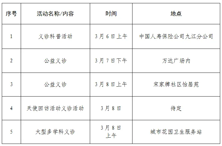 活动内容:妇产科常见病、多发病咨询指导;孕产期保健、更年期健康管理;乳腺常见病咨询指导中医内科、中医妇科、推拿、耳穴;免费测量血压、健康咨询;“艾梅乙”防控、女性健康宣教资料发放。