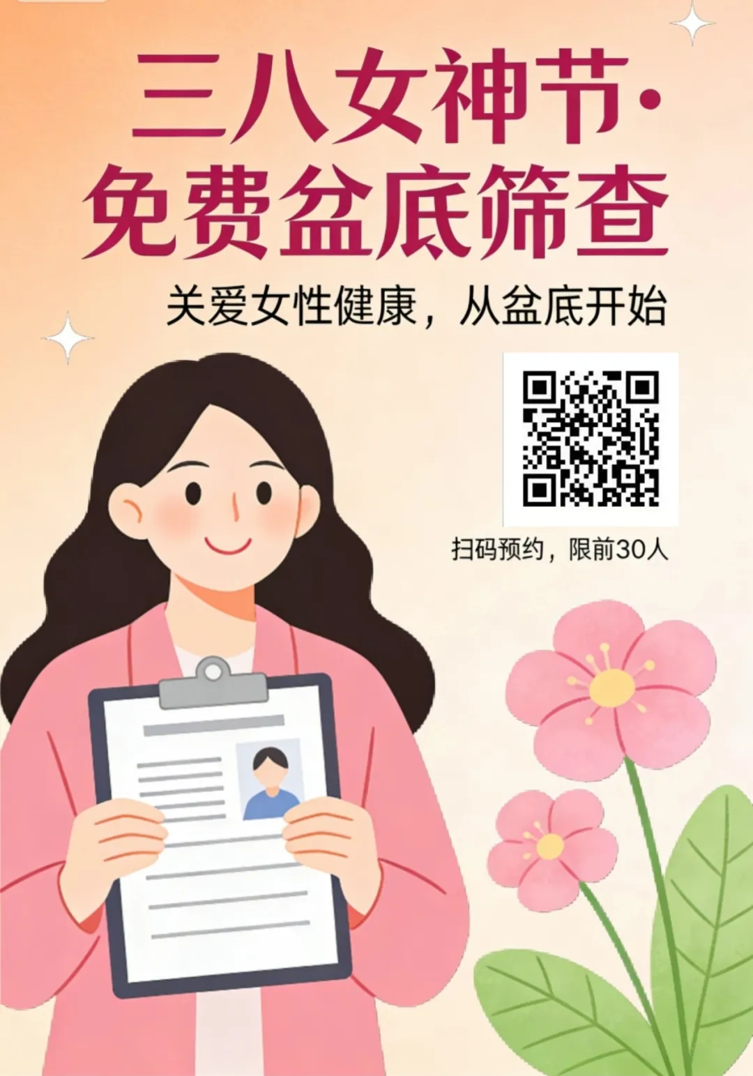 免费盆底肌筛查名额50名,提前预约,每天限5名,为你精准检测盆底肌状态,早发现早调理。