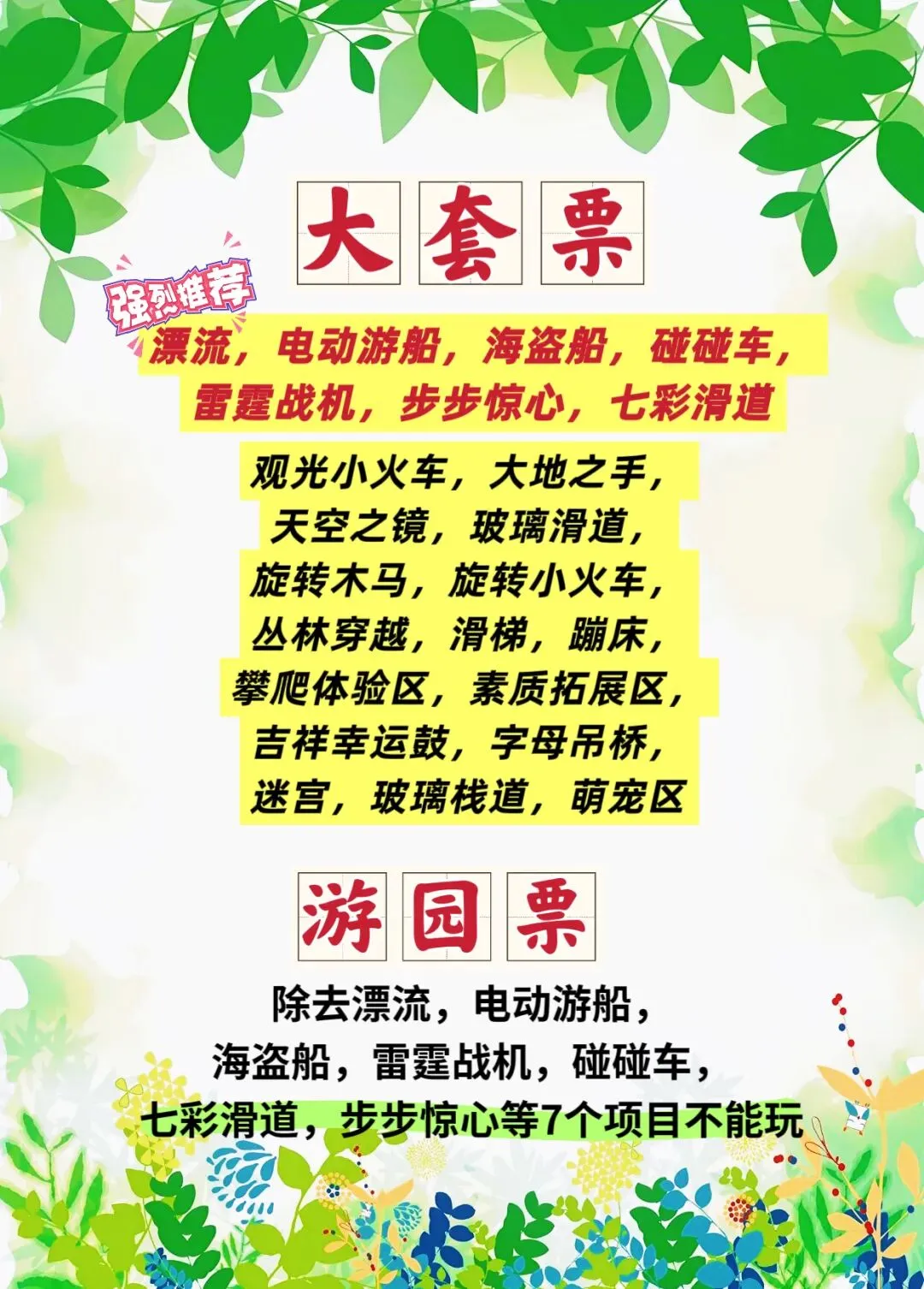 马套将军山水库区大通票:七彩滑道、漂流、旋转木马、旋转小火车、单人蹦床、步步惊心、观光小火车、雷霆战舰、冰激凌转转,以及骑马、划船、碰碰车、素质拓展区、字母吊桥、玻璃栈道、迷宫、吉祥幸运谷、蹦床、丛林穿越、摇摇马、攀岩滑梯、大地之手、高空玻璃滑道、天空之镜和山地滑车。