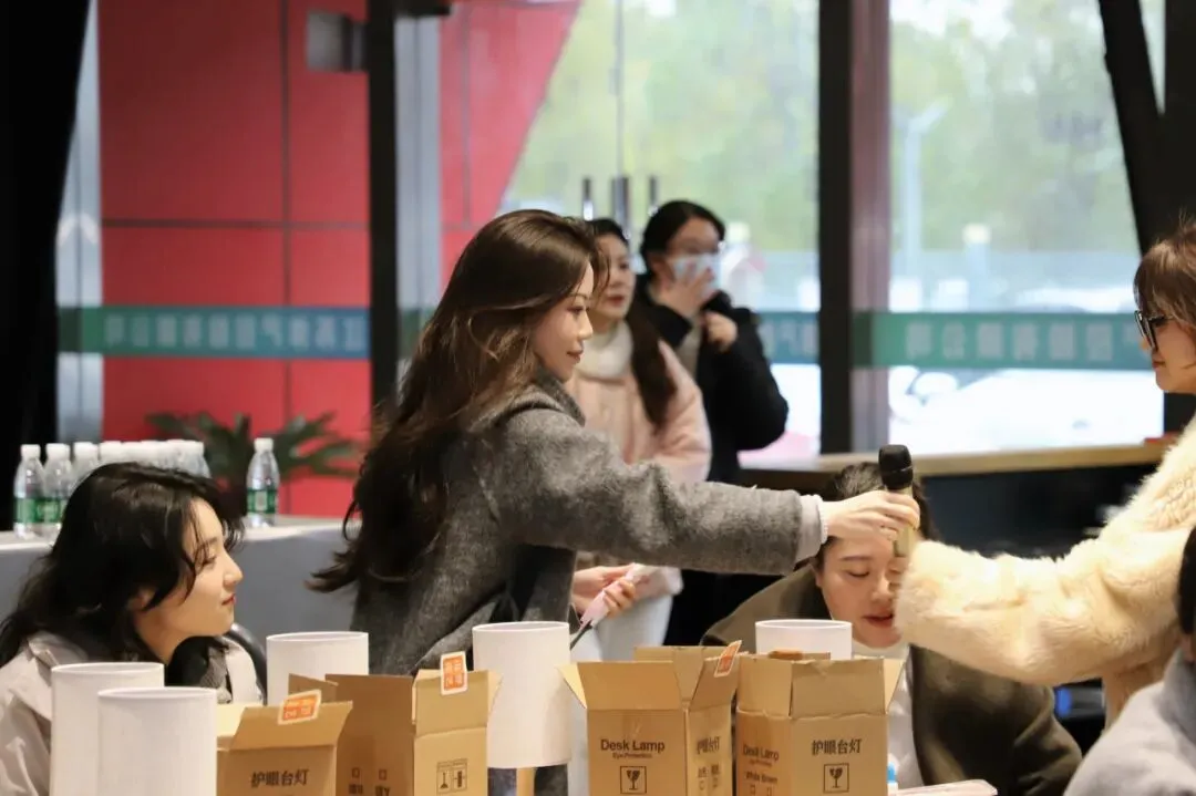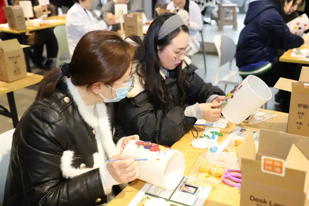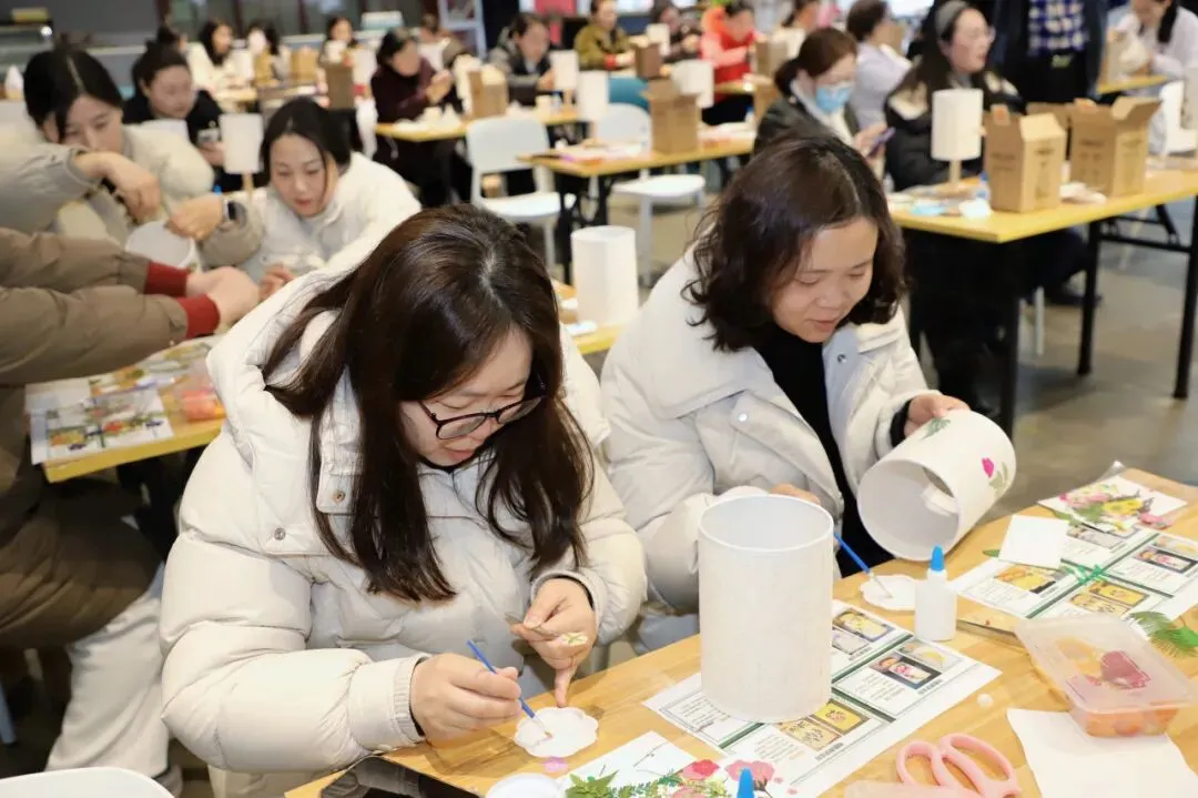 随后的压花台灯DIY环节,大家静心创作,将玫瑰、满天星等干花精心搭配,制作出独一无二的压花台灯。当灯光透过花瓣洒落,每一盏灯都凝聚着巧思与温度。活动中,大家边品尝茶点边畅聊,现场温馨融洽。