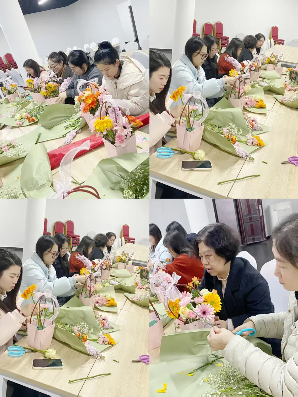 在动手创作环节,女职工们在老师的悉心指导下,修枝剪叶、精心搭配、创意造型,将一朵朵鲜花巧妙组合,用心创作属于自己的花艺作品。大家沉浸其中、交流探讨,在指尖生香的过程中舒缓身心、陶冶情操,充分展现了自信优雅、积极向上的精神风貌。