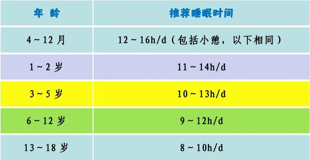 充足的睡眠时间是儿童生长发育的重要保障,生长激素的分泌旺盛时间是晚上10点半到凌晨2点,尽量让孩子在10点前进入睡眠状态。在不同阶段,儿童所需要的睡眠时间如下表
