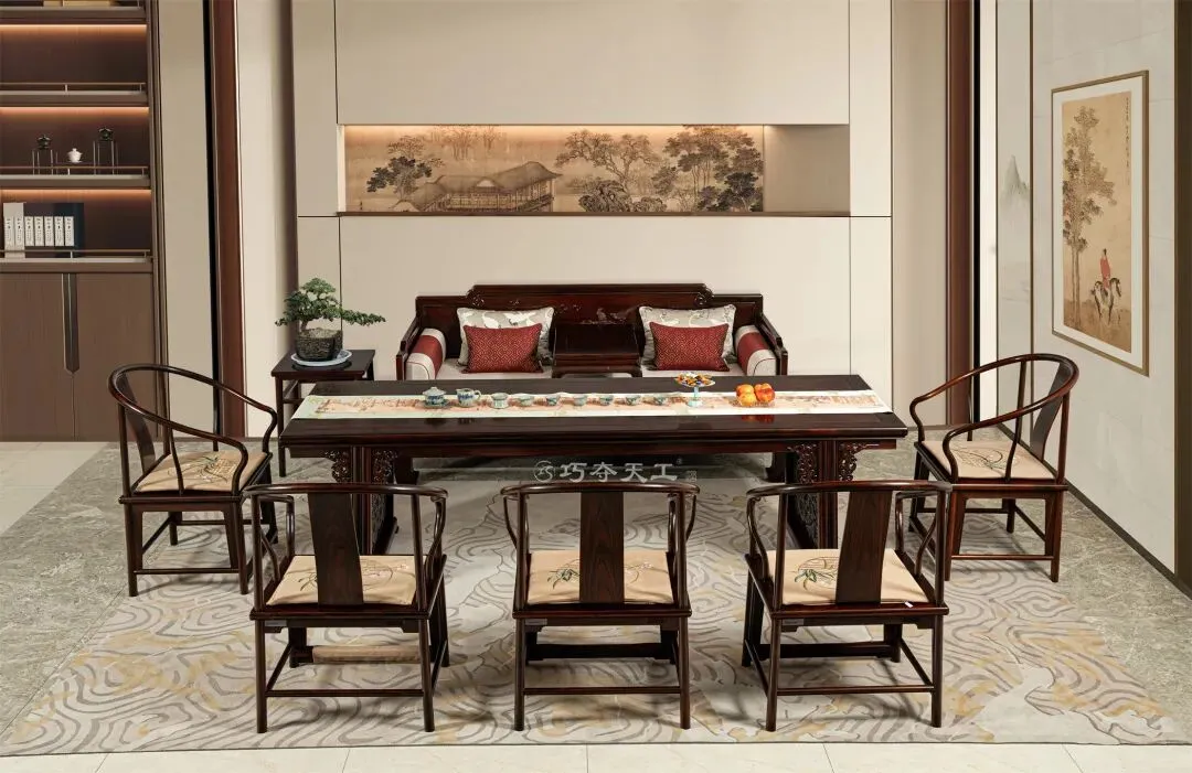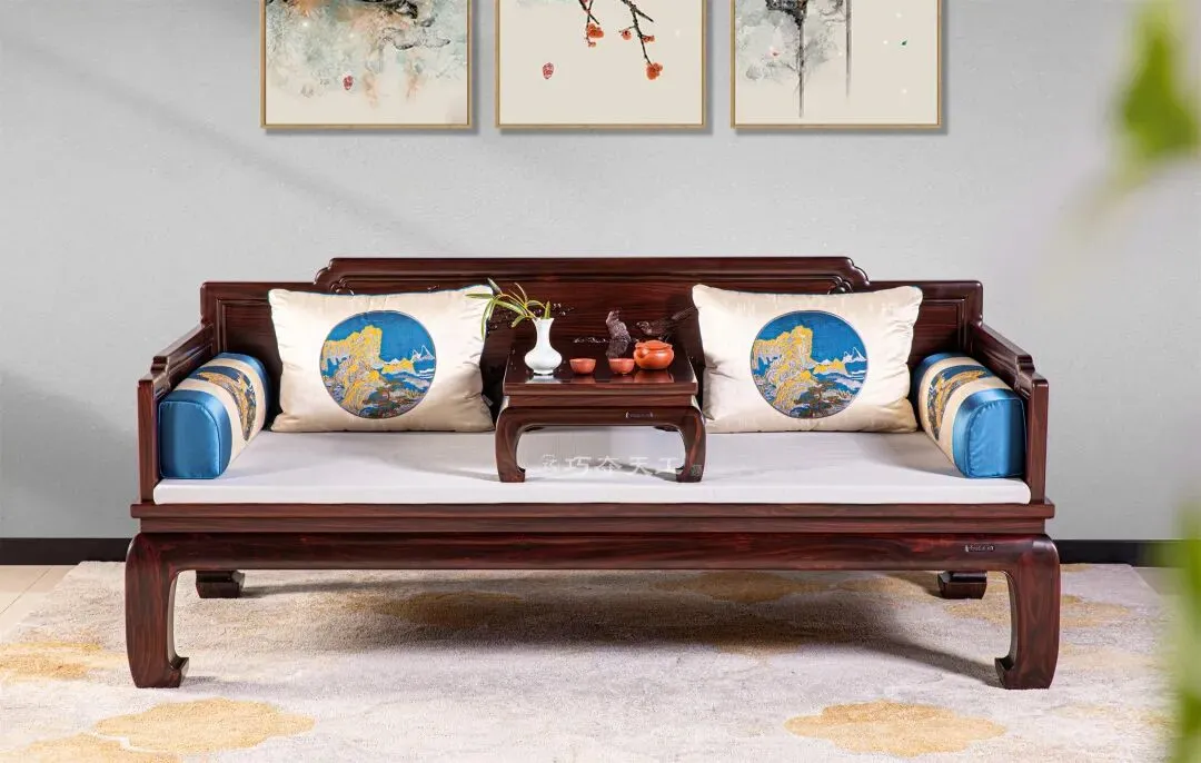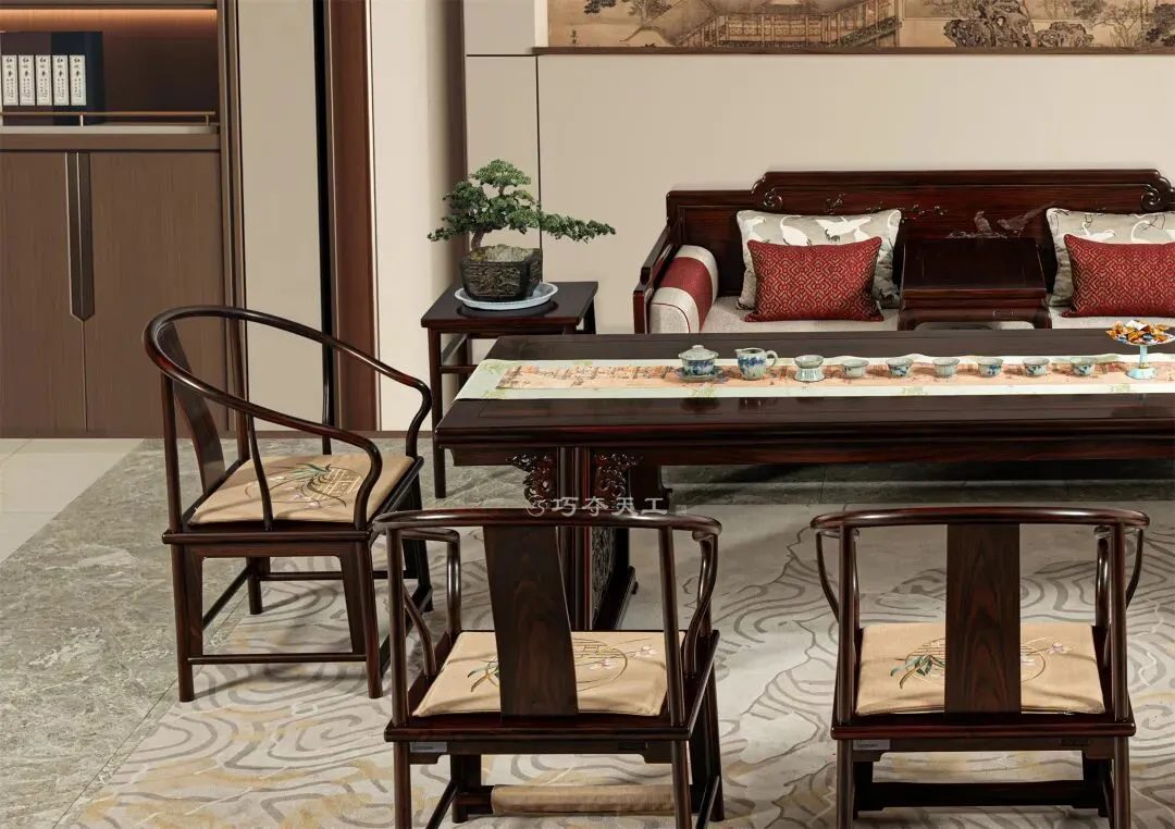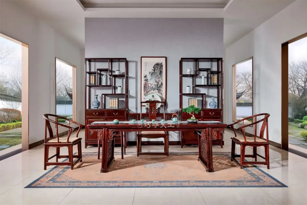 巧夺天工红木打造的“茶台+罗汉床组合”,适配当代女性多元生活节奏。约知己品茶清谈,是社交主场;独处静坐、读书小憩,是精神自留地。
