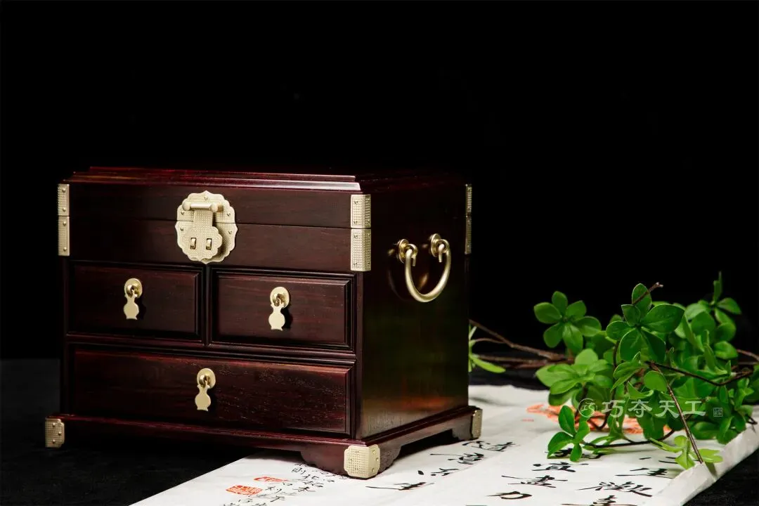 素面首饰盒:以小叶紫檀为材,点缀精致铜件。三层格局,格子大小错落,分类齐全。返璞归真,适合喜欢极简、注重实用功能的气质女性。