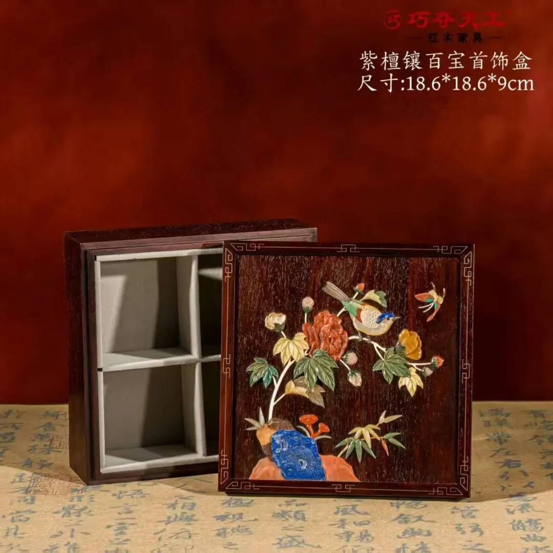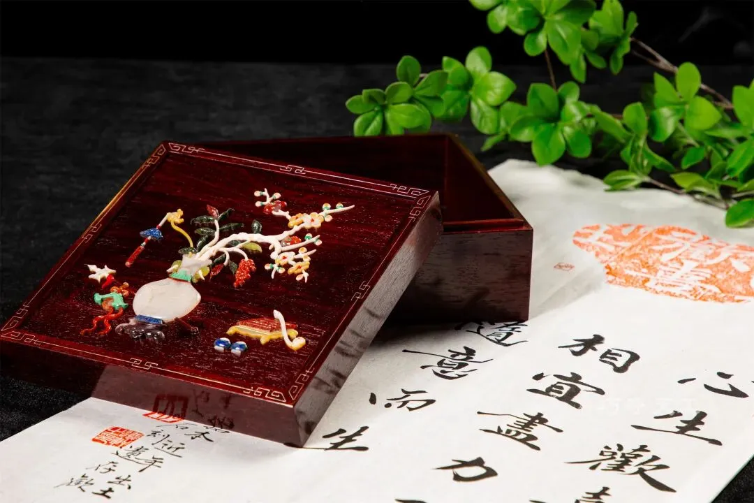 百宝嵌首饰盒:盒面施以精湛的百宝嵌工艺,以各色玉石、玛瑙、珊瑚、白贝镶嵌出枝叶花朵,画面生动自然。光影流转间,盒面闪烁着宝石的温润光芒,为收纳增添无限趣味。