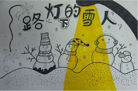 这幅作品以黑白线稿搭配暖黄灯光的撞色呈现,描绘了冬夜路灯下,几个形态各异的雪人依偎取暖的温馨画面。