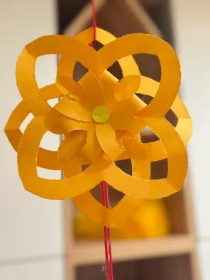 这件手工纸艺作品名为《金盏花团》,是用暖黄色卡纸通过剪、折、粘等方式层层叠加而成的立体挂饰。外层由镂空的圆环交织成舒展的花形轮廓,内层是细腻的花瓣层层聚拢,中心点缀着黄色的圆点,整体造型饱满又富有层次。