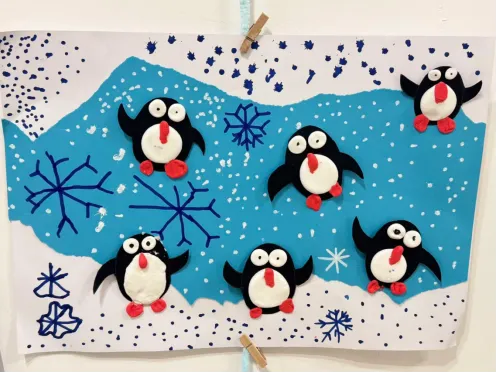 作品《企鹅冰上派对》,是小朋友通过多种材料和手法共同完成的创意手工作品。作品以深浅不同的蓝白色卡纸为底,用海绵蘸取颜料点洒出漫天飞雪的效果,并用扭扭棒弯折出形态各异的雪花,营造出冬日冰原的氛围感。憨态可掬的企鹅主体是用黑色卡纸剪出轮廓,再用白色黏土塑造出圆滚滚的肚皮,搭配红色黏土做的喙和脚掌,最后贴上活动眼睛,让每一只企鹅都显得生动又俏皮。整个作品色彩明快、造型可爱,充满童趣,展现了小朋友对冬日极地小动物的观察与想象。