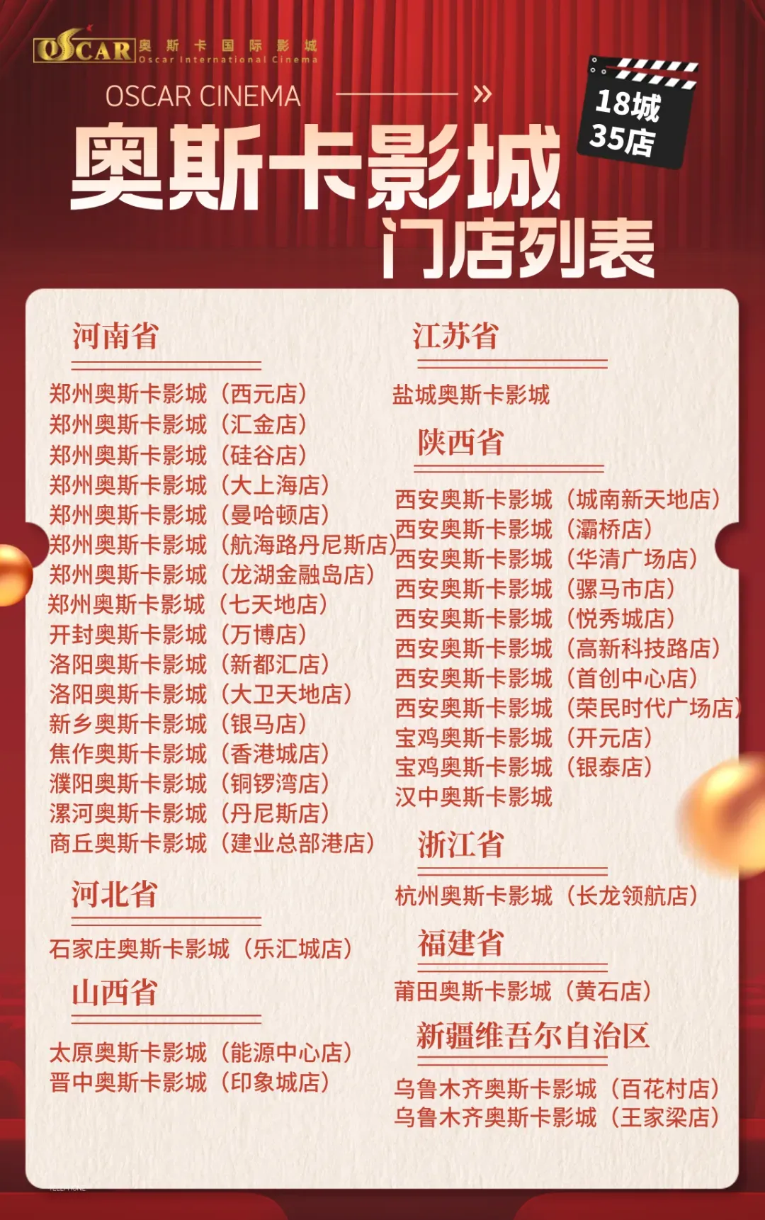 活动影城:新乡银马店、濮阳铜锣湾店、开封万博店、焦作香港城店、商丘建业总部港店、漯河丹尼斯店、洛阳新都汇、大卫天地店。
