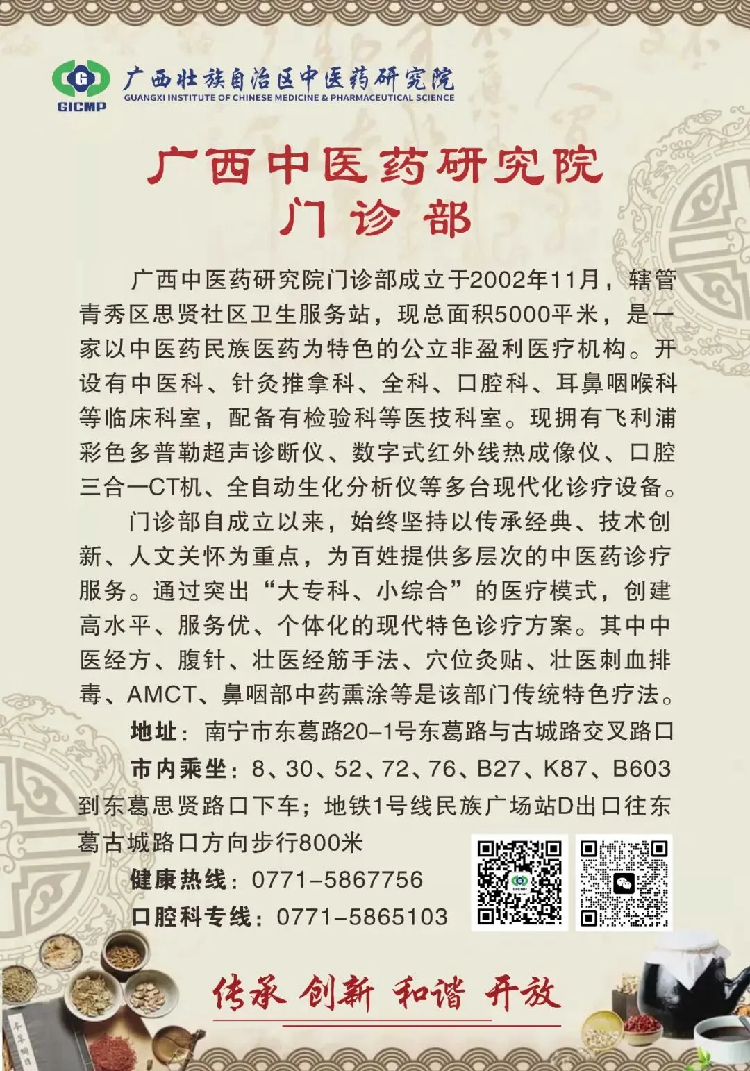 1、“3.8多学科义诊”:3.8日早上9:00-11:30,在广西中医药研究院门诊部前广场进行多学科义诊及中医技术体验(中医科、妇科、全科、针推科、口腔科等),免费体验中医脉诊、舌诊、体质辨识等;