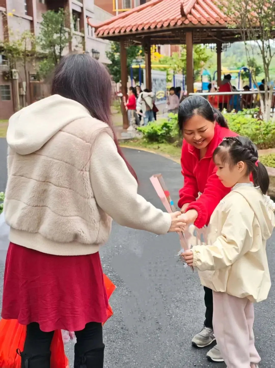 大班级的小朋友在园长妈妈和老师陪同下,沿街将手中的祝福提前送给幼儿园附近的“女神们”。