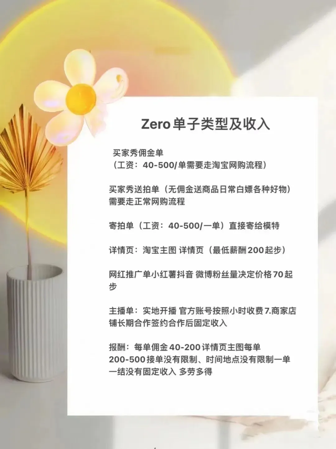 买家秀:就是寄拍单,寄拍就得有模卡(自己的9张照片,按规定拼成九宫格),平台会审核模卡,通过的才能接买家秀,通常佣 35-100不等,流程跟文字单差不多,只不过商家会挑选模卡,百里挑一也是毫不夸张的。后续也一样,只不过是发真实物品,按照拍照p图,然后发给商家审核,通过后评论,再把商品寄回去,商家收到商品,检查完好就返本 和佣 ,商品破损,就相当于自购