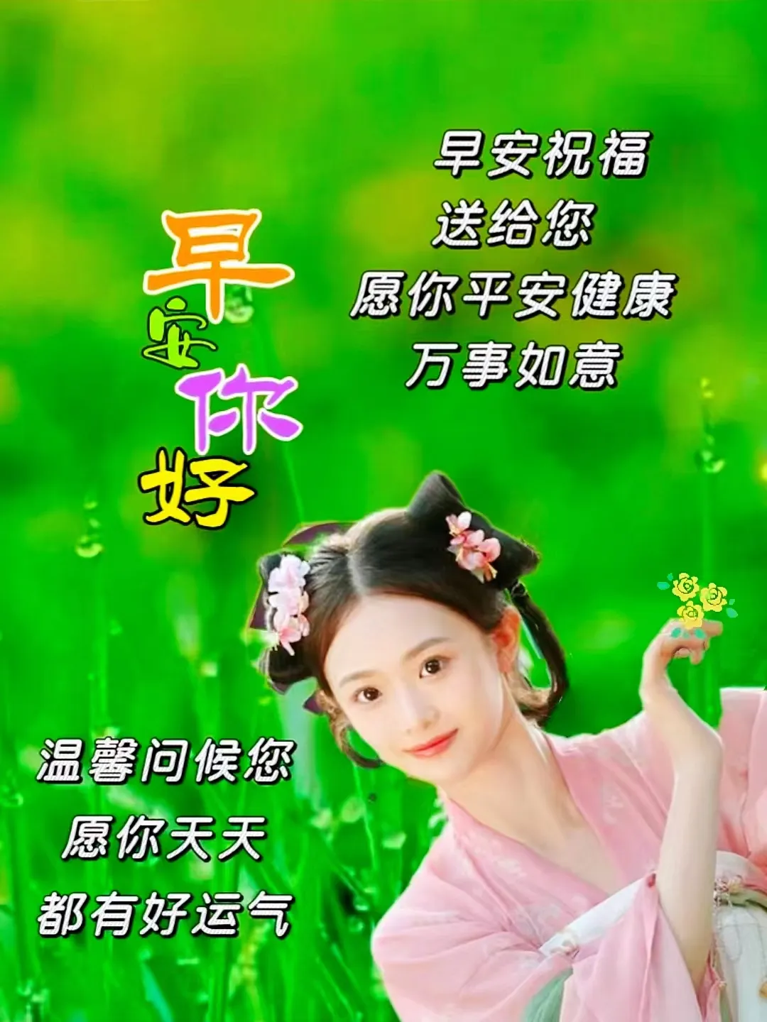6,问候不论距离远近,有意就好。牵挂无须时间长短,有心就好。书信不管忙碌与闲,有情就好。发送邮件无需何方,收到就好。祝福朋友:年年有余,财源广进,祥瑞绕身,前途无量。友谊之路,长长久久。早上好~!