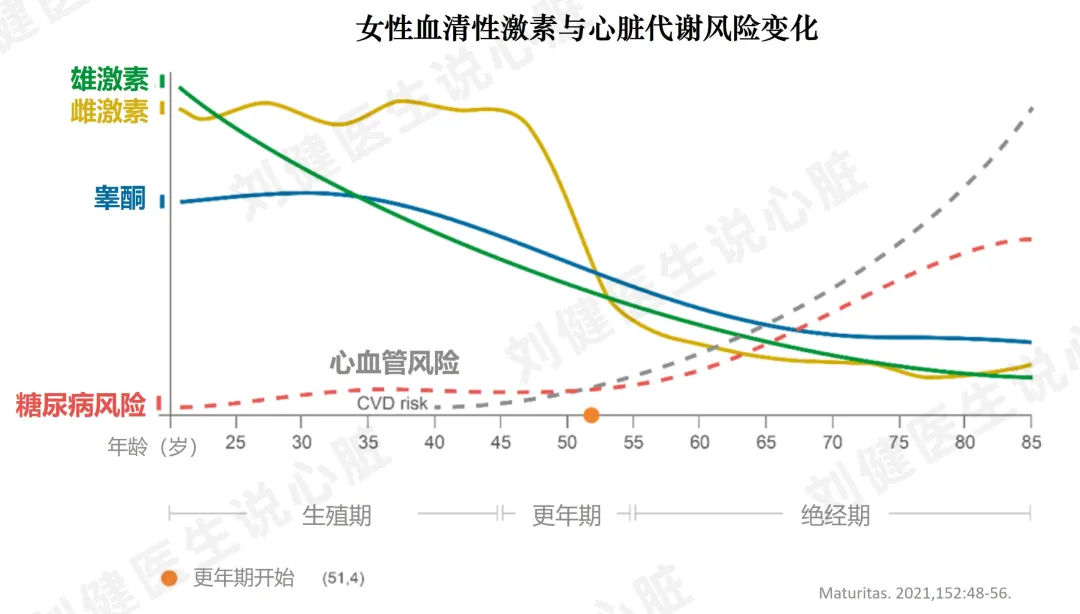 对女性来说,更年期不只是上述的外在表现,随着激素水平的变化,全身代谢和心血管系统进入了“重构期”,这时期的风险累积将影响女性绝经后数十年[1]