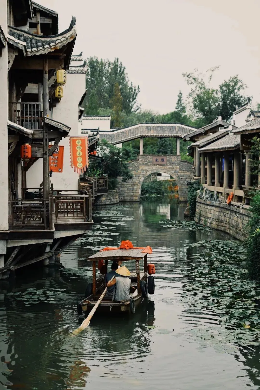 春风拂过古建长廊,摇橹船轻摇碧波。