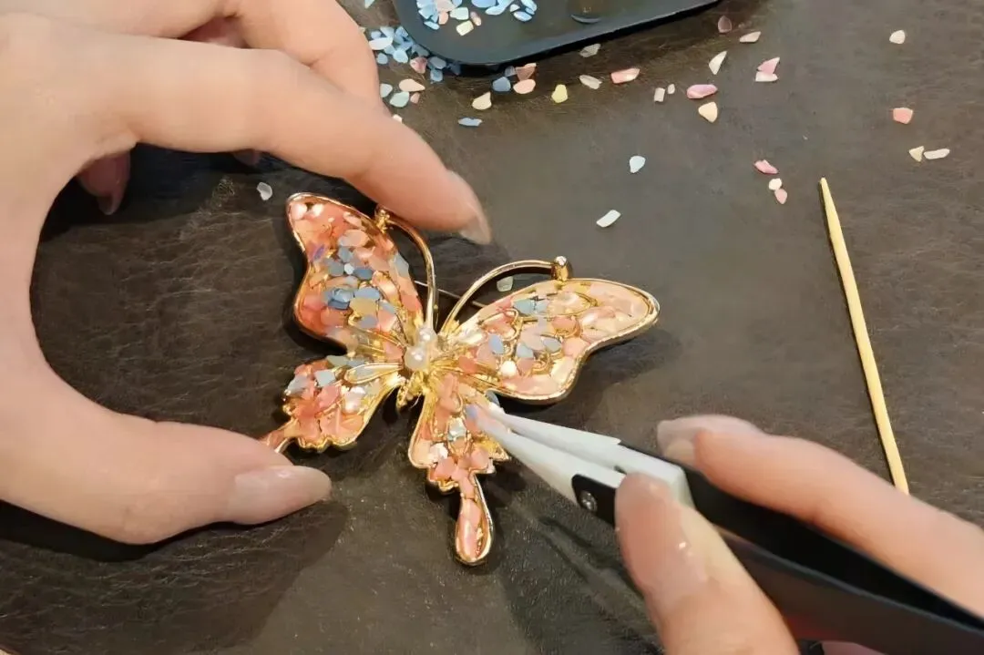 课程介绍:采用环保仿翠材料替代传统翠羽,传承点翠技艺的精髓。学习羽毛处理、剪裁、粘贴与造型,制作一枚流光溢彩的点翠胸针或发簪,重现古典首饰的灵动华贵,兼顾美学与生态保护。