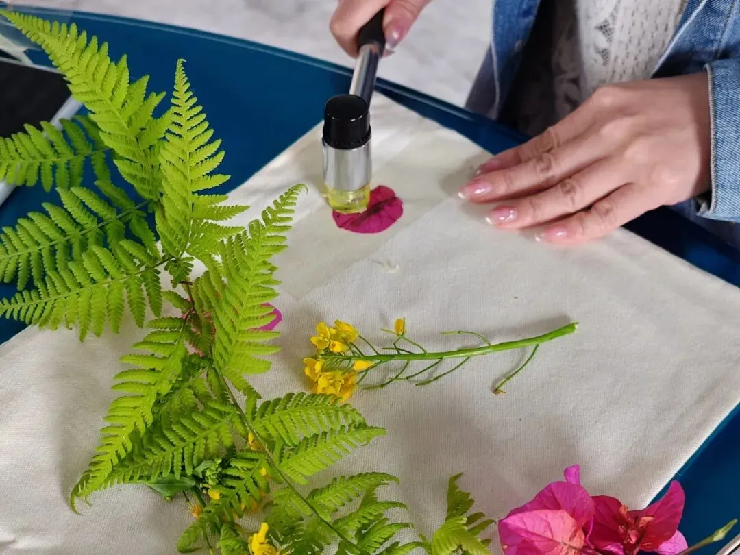 午餐后,一场治愈系的植物拓染 DIY 开始啦!摘一片嫩叶,拾一朵小花,用锤子轻轻敲打,把大自然的色彩永久定格在布袋上。