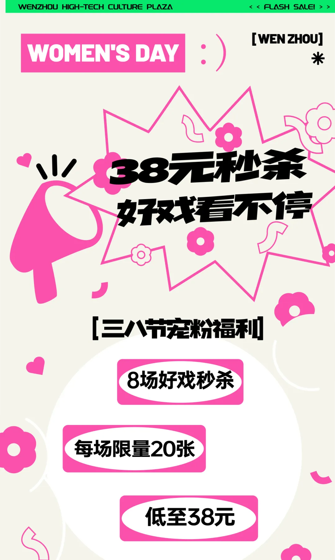 三八节宠粉福利来袭,多款演出剧目闲适限量秒杀价!3月8日上午10点,准时锁定“温州高新文化广场票务助手”小程序,最低38元多场好戏等你来!