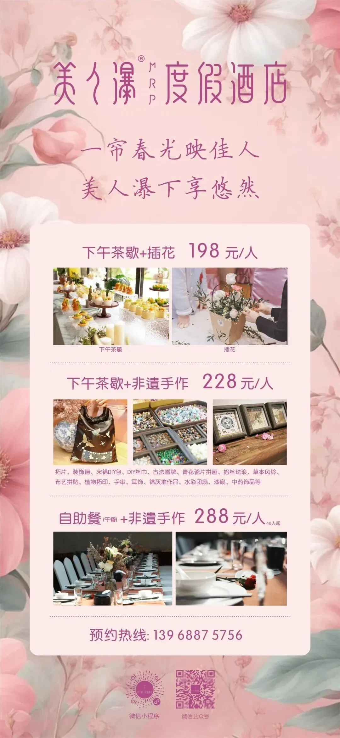 悦己,越从容,每一个闪光的日常,都值得被大自然犒赏:赏花、品茶、听风、观山于非遗手作中,触摸东方美学,3月8日,美人瀑度假酒店邀你于瀑下私汤里享受松弛人生~