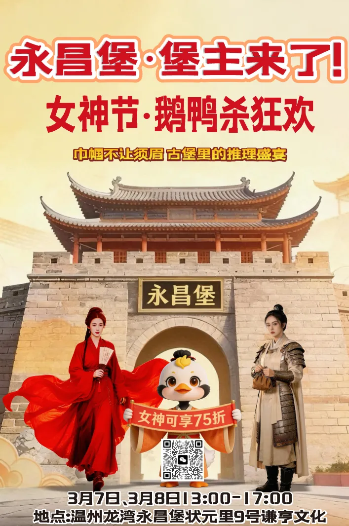 女神节·沉浸式线下鹅鸭杀狂欢!巾帼不让须眉,古堡里的推理盛宴等你来玩!38元即可享受汉服体验,身着汉服更入戏!