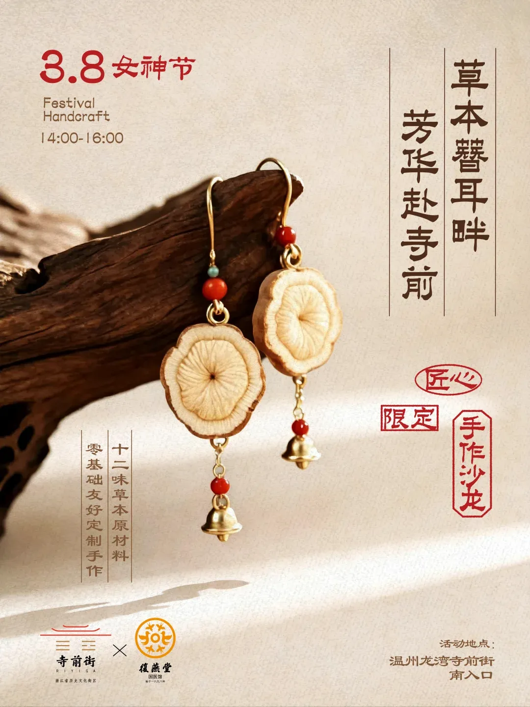 草本耳环手作沙龙:女神节限定手作,把春天戴在耳边,用天然草木做一对专属耳饰,把春日的温柔戴在身上;