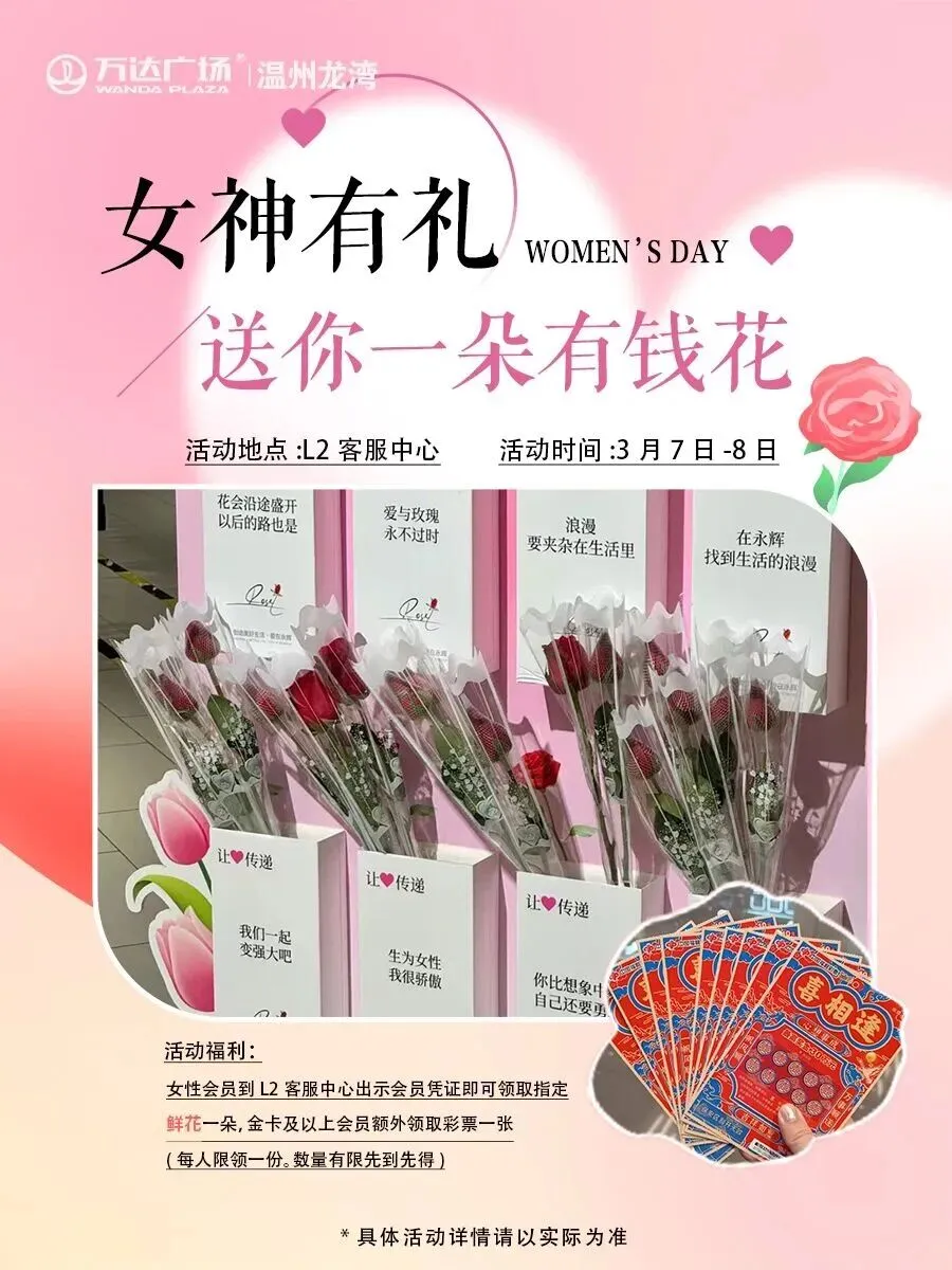女性会员到L2客服中心出示会员凭证即可领取指定鲜花一朵,金卡及以上会员额外领取彩票一张。(每人限领一份,数量有限先到先得)