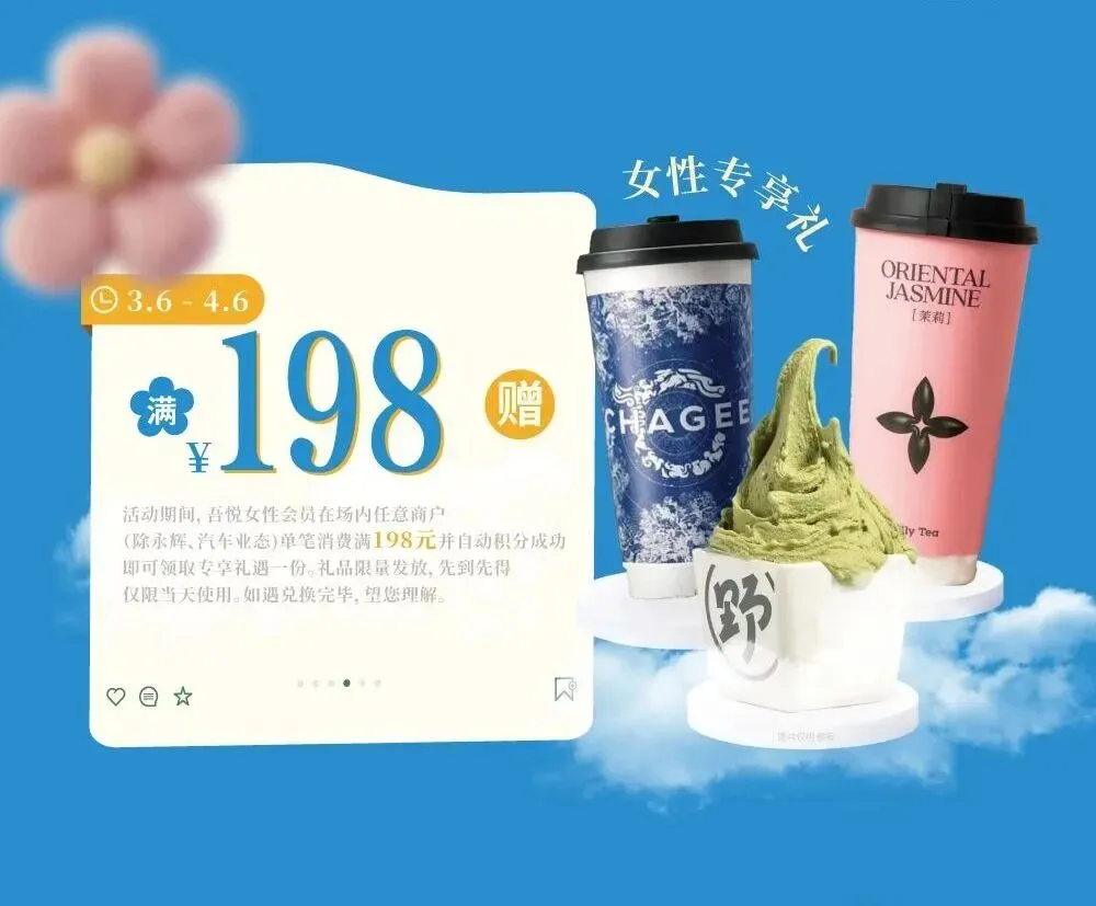 活动期间,吾悦女性会员在场内任意商户(除永辉、汽车业态)单笔消费满198元并自动积分成功,即可领取专享礼遇一份。礼品限量发放,先到先得仅限当天使用;