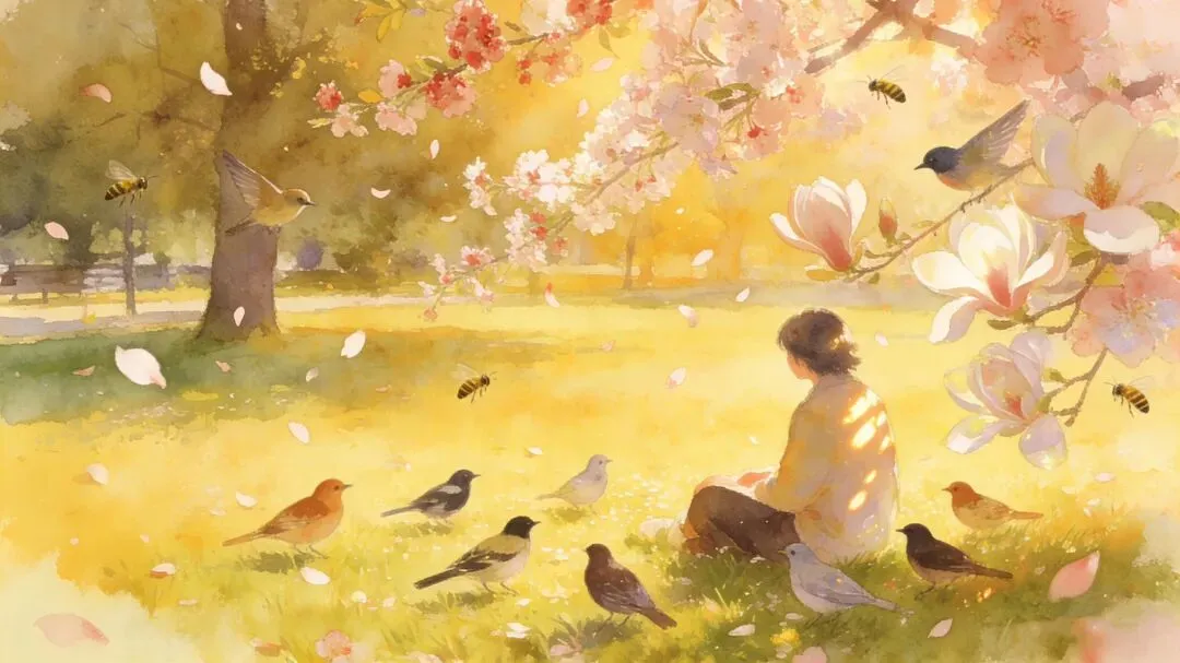 给自己一个无人打扰的下午,选一块公园的空地,让身体浸泡在春天的阳光里,梅花、樱花、玉兰在你身边开着,时不时飘下轻柔的花瓣。你可以听到至少十种鸟的叫声,蜜蜂的嗡嗡声比电脑的嗡嗡声美妙一万倍。你还可以带一本书,把书中的人物带进这个下午,带到你的身边,你们可以共情、争论,甚至痛哭……然后你看着天色暗下去,霞彩温柔,远处马路上车子又成了发光的长龙,你能想到某些正在经历堵车的人烦躁地摇下车窗,一想着回家后还要给某个客户改方案就皱起了眉头……多么好,你在林荫小道上缓步走着,脱离了生活的一切烦恼,虽然也许只是半天。