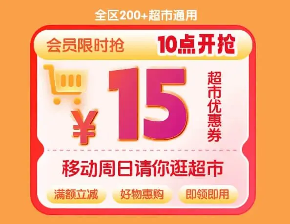 周日10点会员限时抢15元超市券