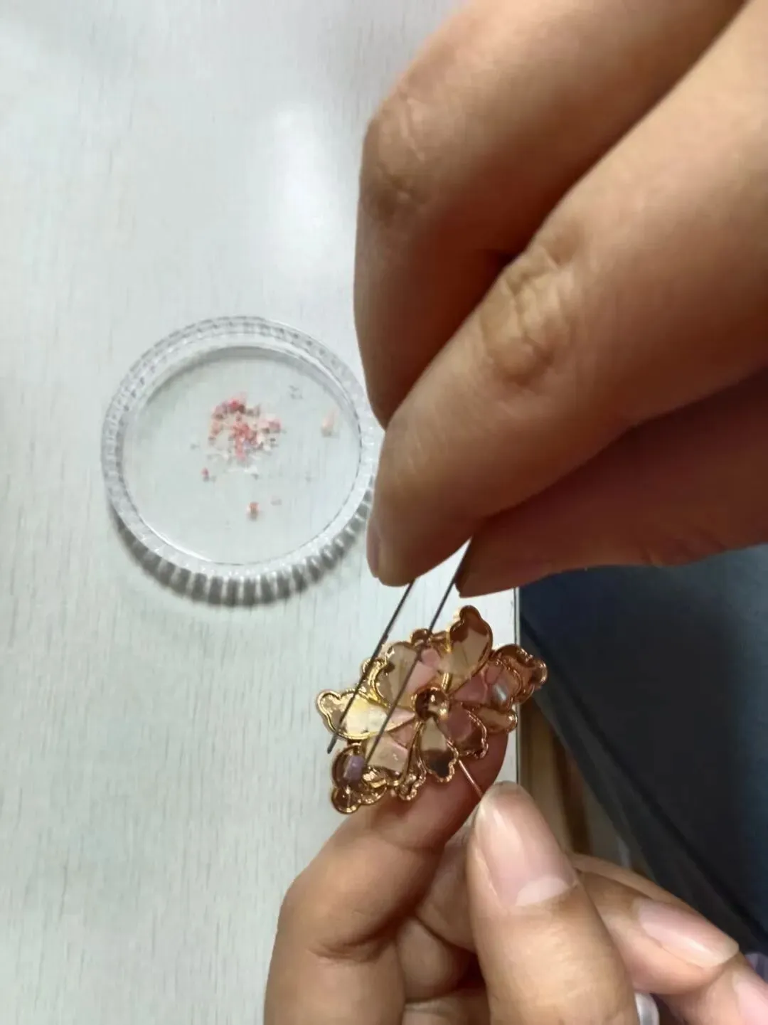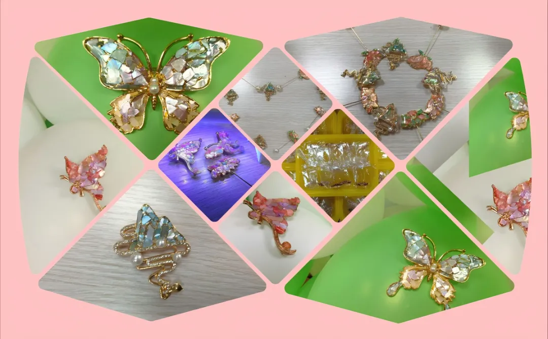 一片,两片,三片——把深海的光,一点一点嵌进小小的胸针里。有人贴了一朵小花,举起来对着窗子看,光从背后透过来,螺钿亮了,她的眼睛也亮了。有人说像太阳,有人说像春天的第一片叶子,有人说像孩子笑起来的样子。