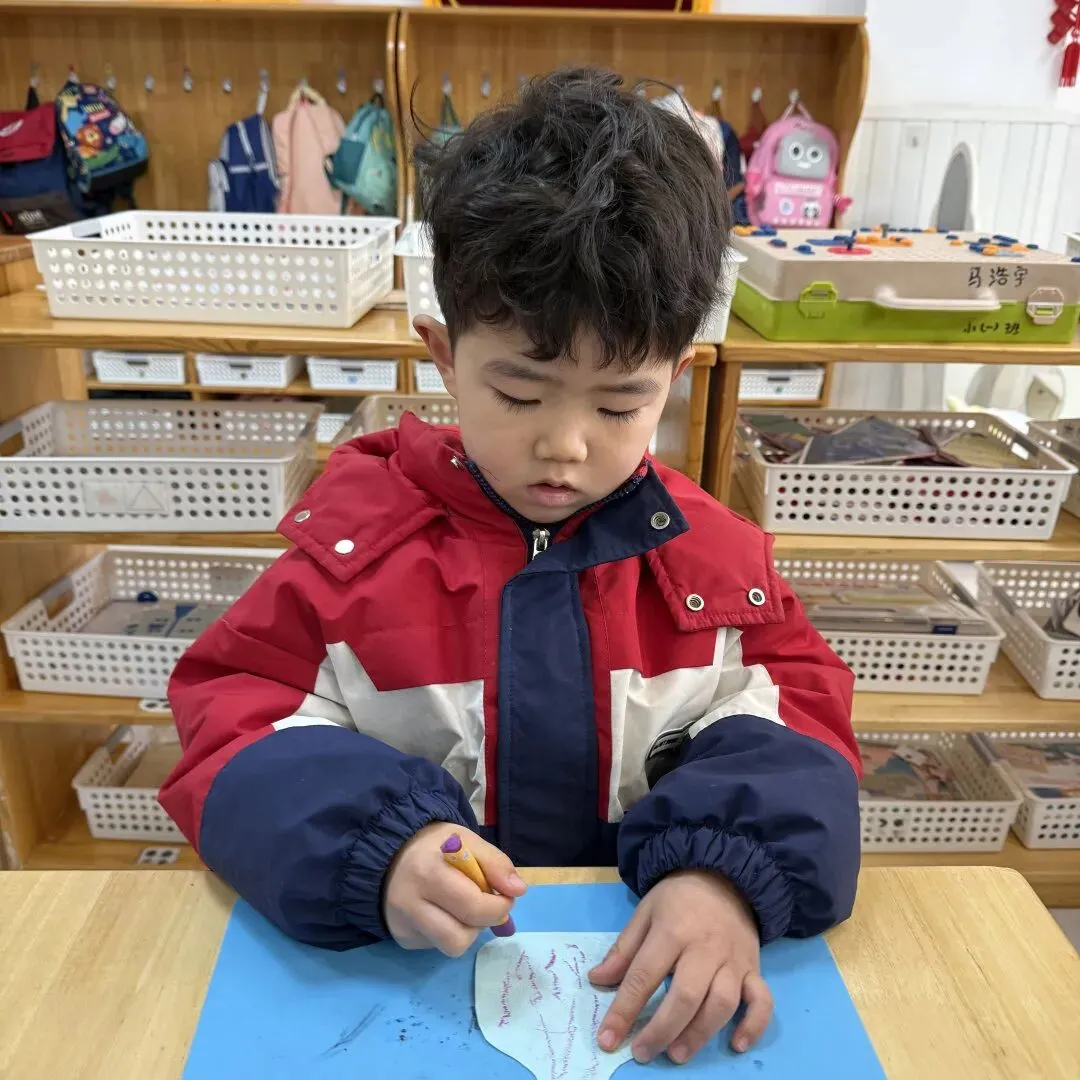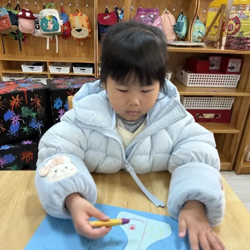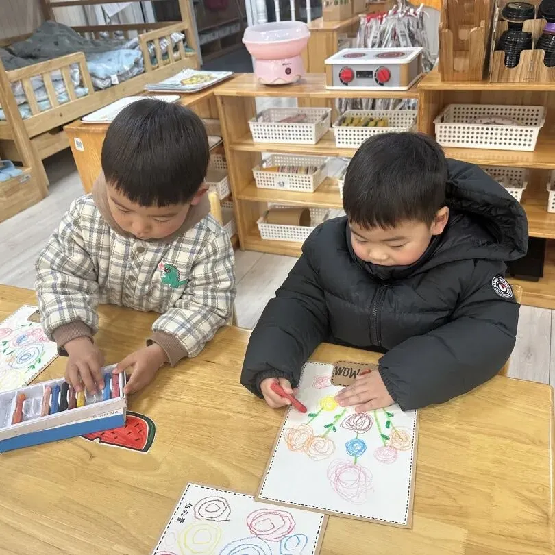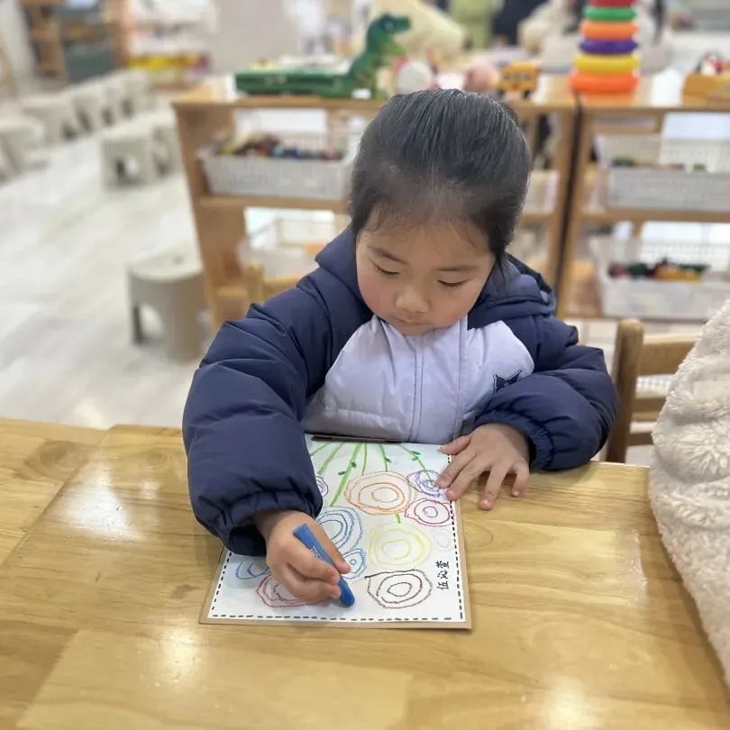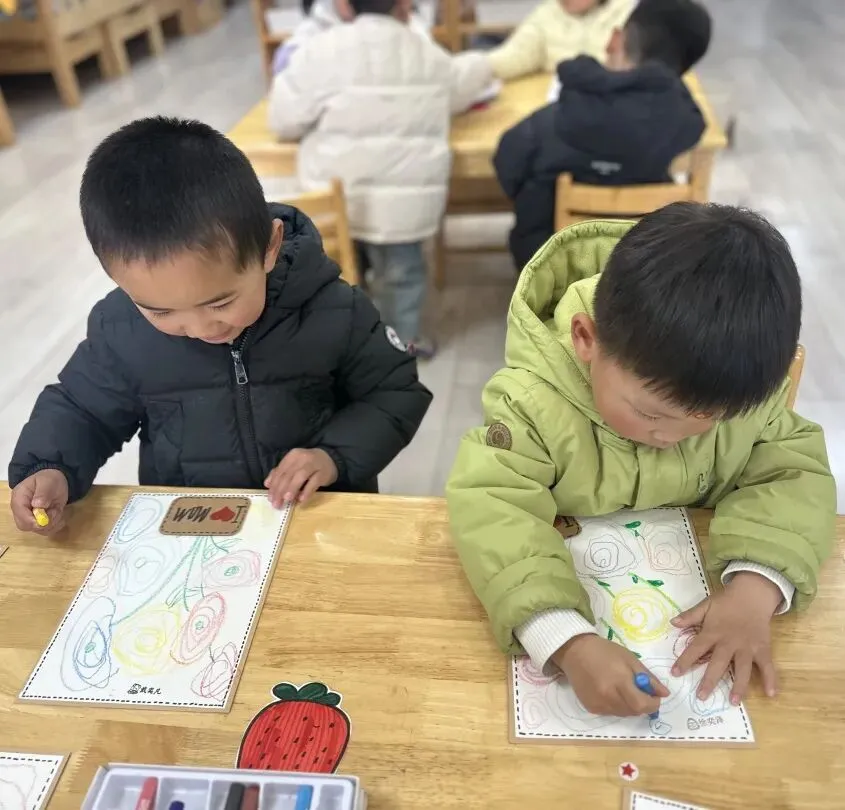 孩子们手握油画棒,在画纸上一圈一圈地认真涂抹,原本简单的线条,在他们的巧手下渐渐变成了一朵朵色彩斑斓、层层叠叠的“圈圈花”。