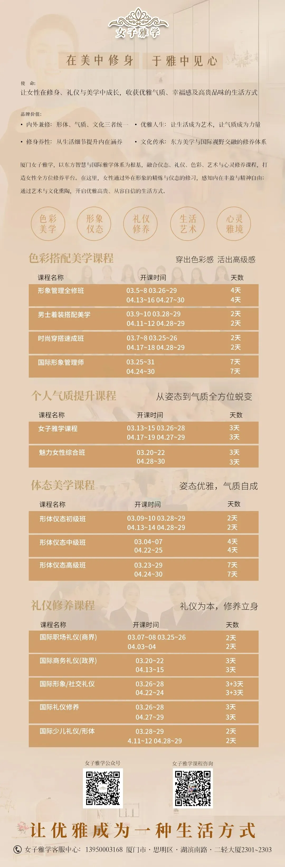 《女子雅学》课程(3月13-15日)即将开启,3天系统学习,从色彩搭配到形体仪态,从礼仪修养到生活美学,帮你重塑气质,让美由内而外绽放,从容优雅地活出更好的自己。