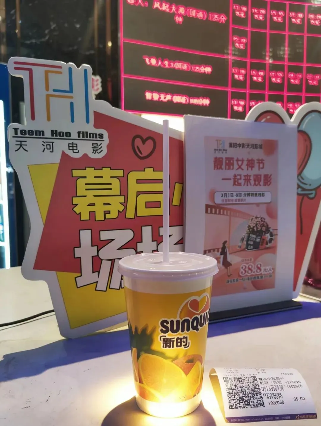 38.8元/人 = 电影票1张 + 桃橙果汁1杯