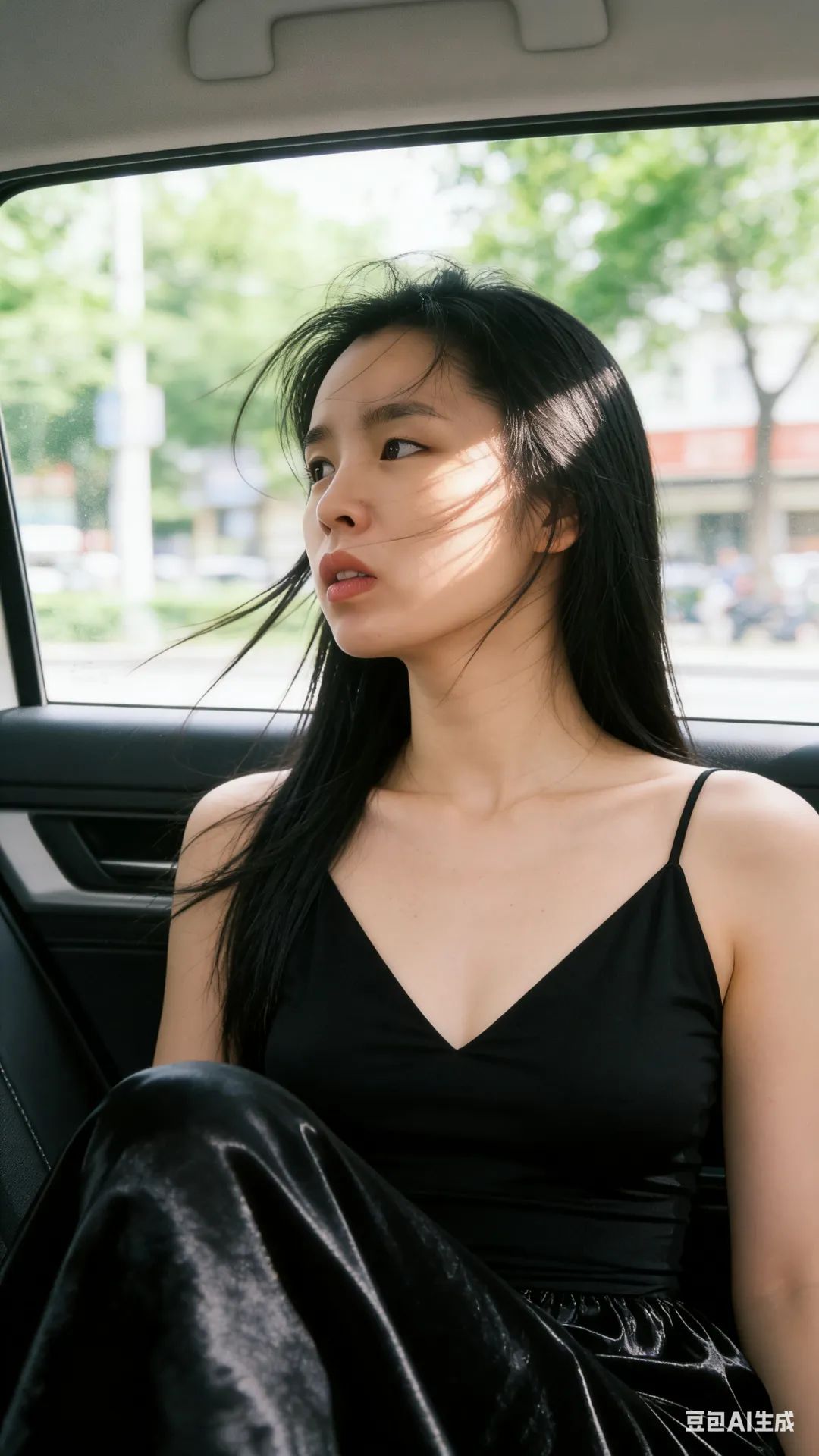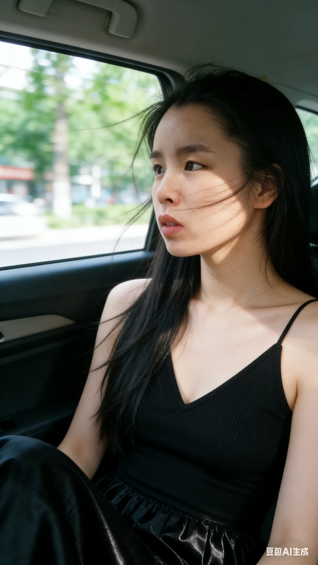 帮我生成6张图片:保持五官不变,以车内场景为核心,透过车窗能看到清新的街景绿意,营造出日常又松弛的氛围;发型为黑长直,被风吹起,衣服漏肩v领黑色紧身吊带,下面是黑色质感长裙,画面捕捉看向镜头或窗外,营造城市出行里的慵懒片刻,头发丝和脸上都有光影效果,结合简约穿搭与清新窗外景,传递出舒适自在的生活氛围感。富士胶片感,9:16比例。