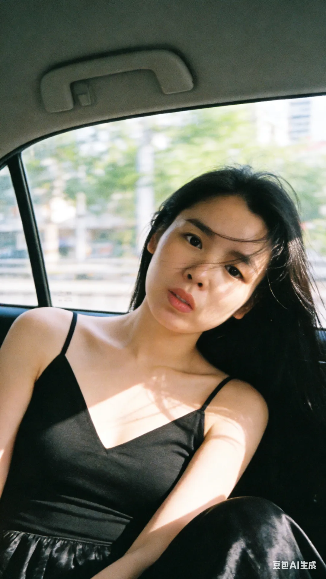 黑长直被风吹起的弧度刚刚好,漏肩吊带和黑色长裙的质感拉满,没有一点廉价感;车内的光影细腻又自然,脸上的光影层次分明,连头发丝都有柔光效果,氛围感直接拉满。透过车窗的街景绿意清晰又不抢镜,完美衬托出松弛慵懒的气质,富士胶片感更是加分项,自带复古滤镜,不用后期P图,直接就能发朋友圈。