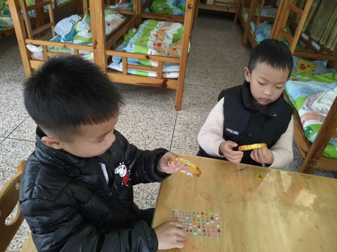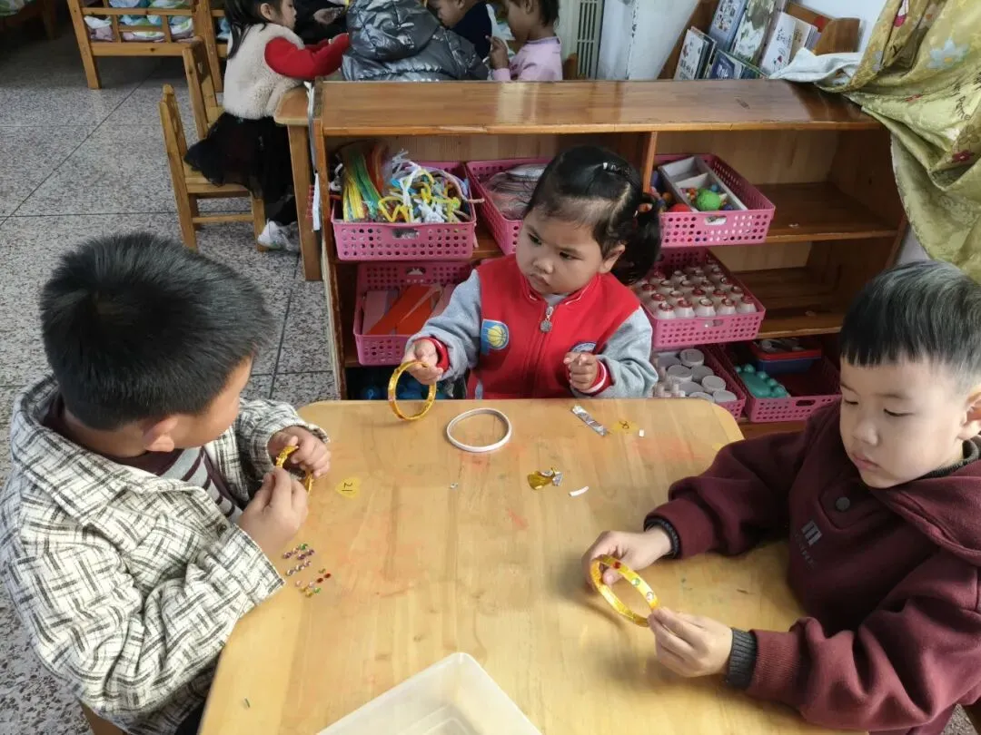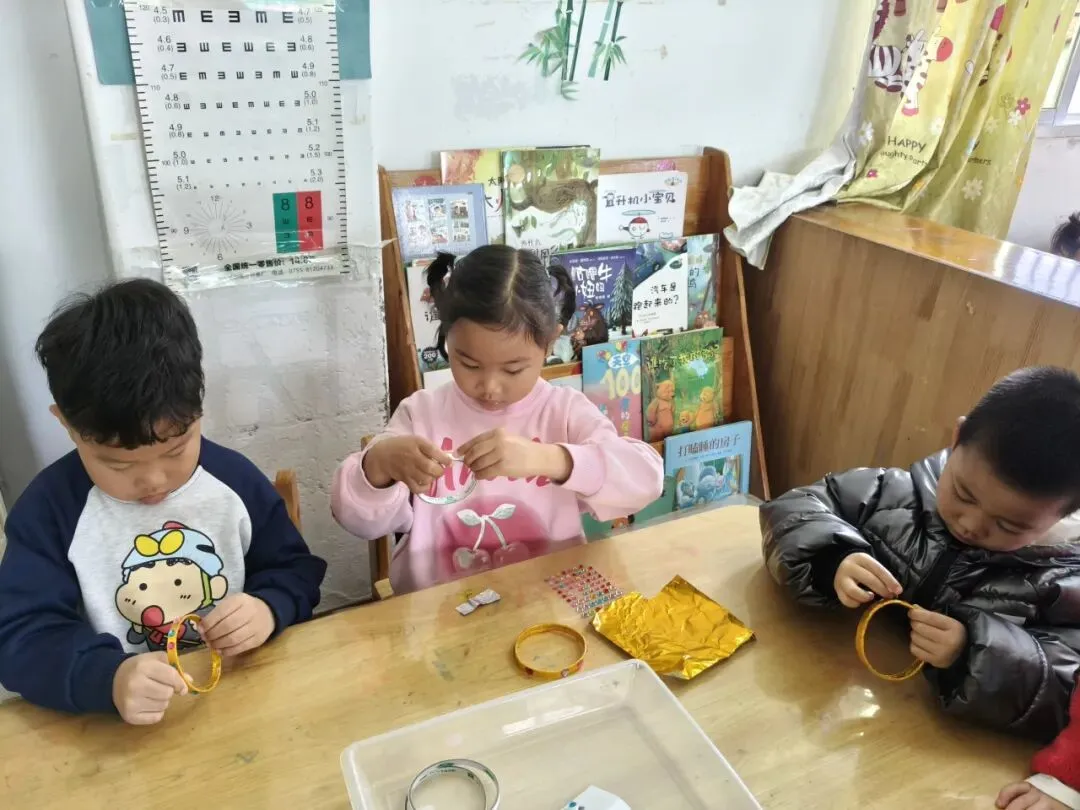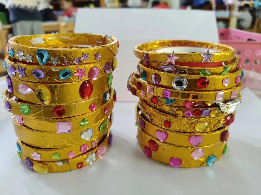 中班的孩子们用各种不同形状的、亮晶晶的“钻石”在手镯上做点缀,为家中的女神制作精美的手镯。
