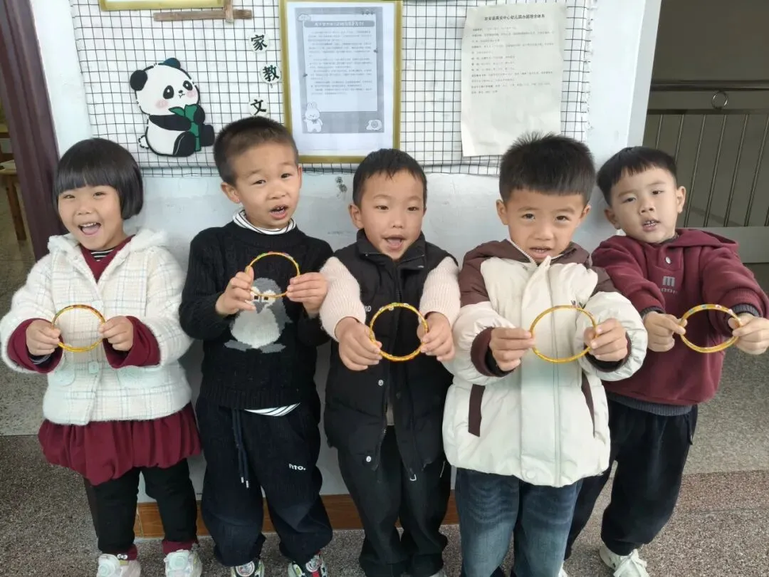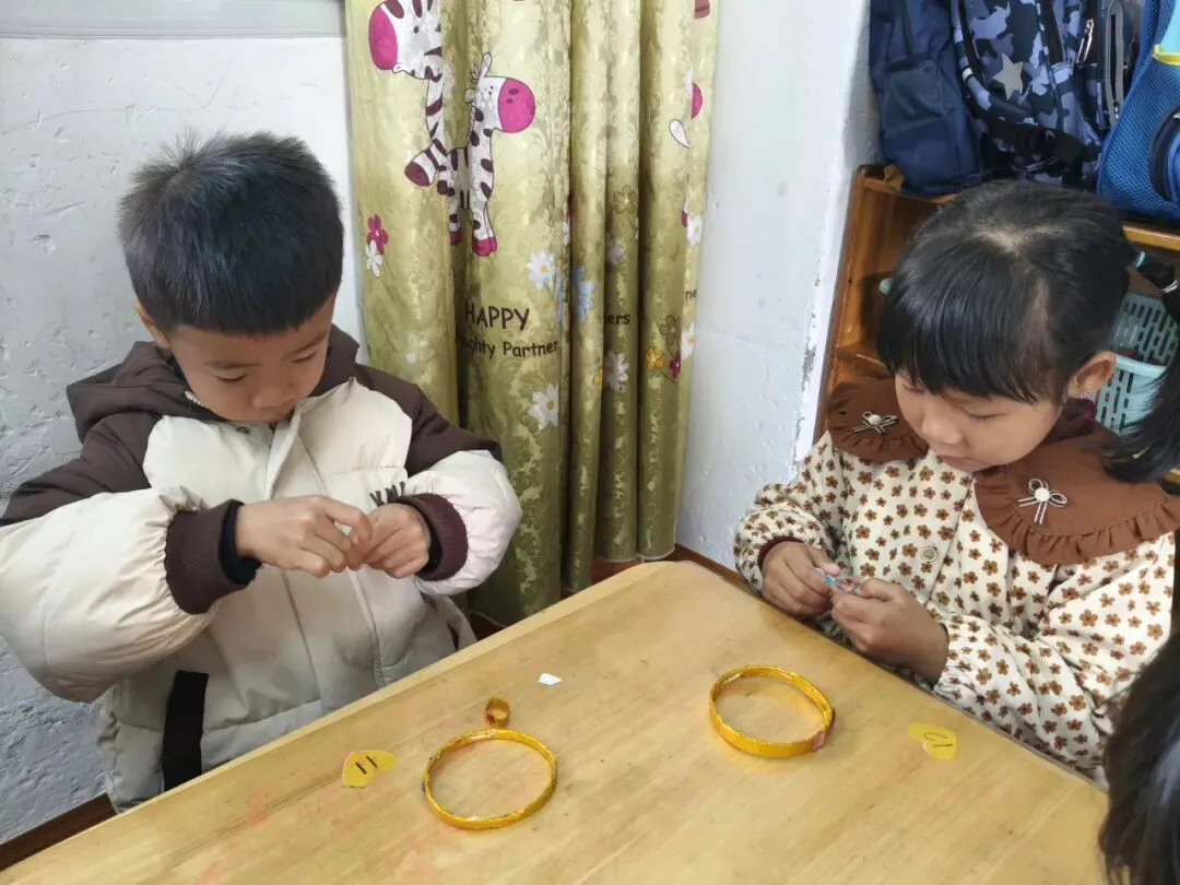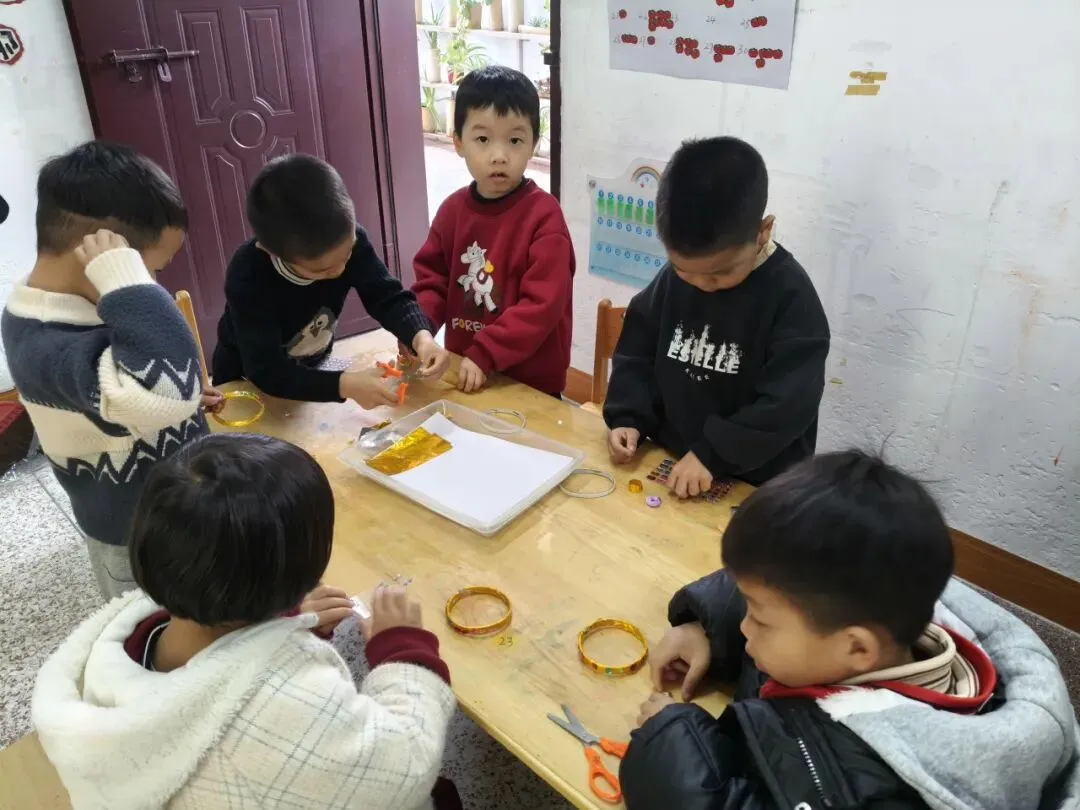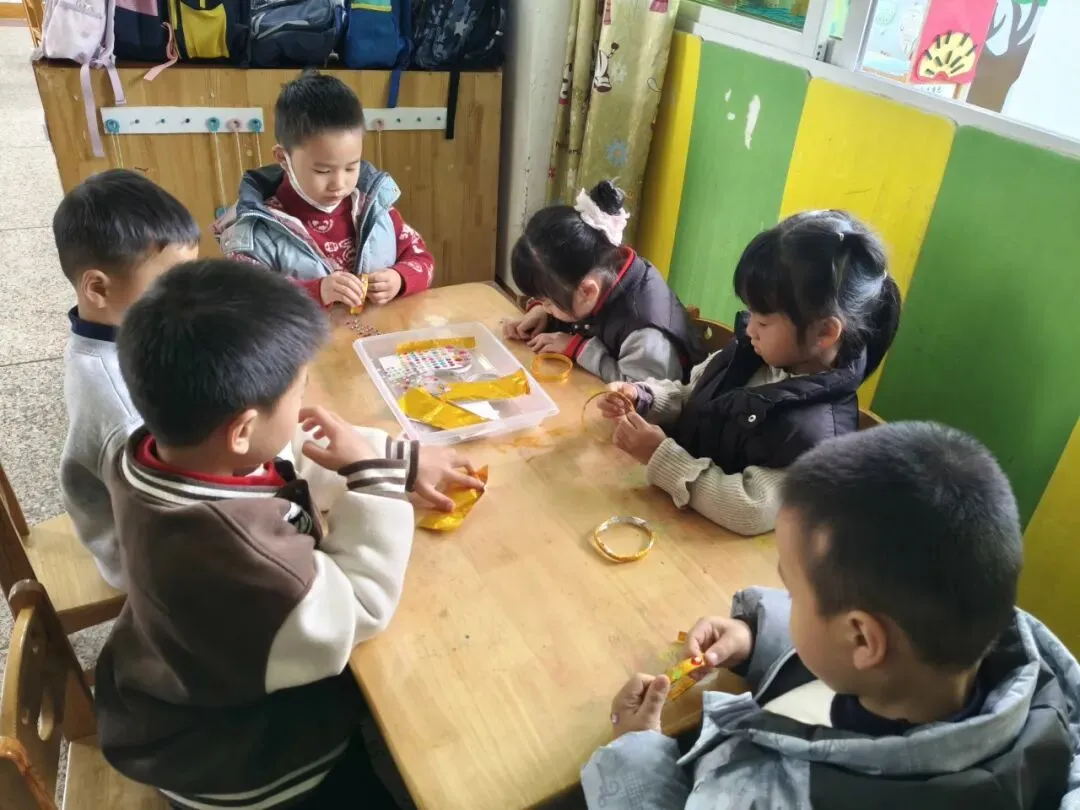 中班的孩子们用各种不同形状的、亮晶晶的“钻石”在手镯上做点缀,为家中的女神制作精美的手镯。