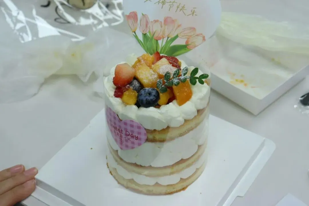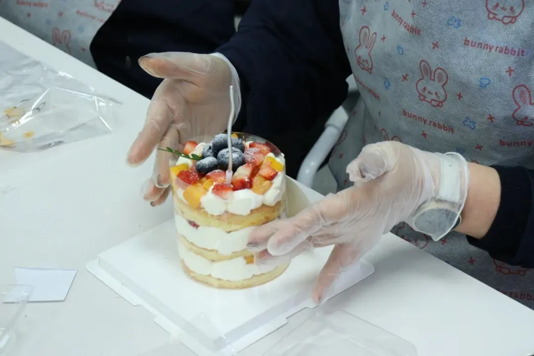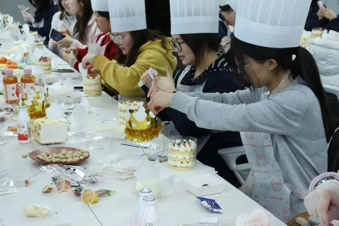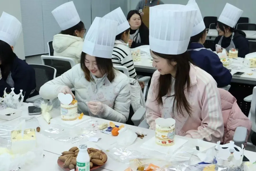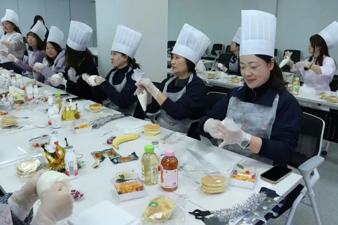 空气中弥漫着奶油和水果的香甜。在专业烘焙师现场教学中,我们的女神们,把工作中的严谨和专注带到了这里——有的认真研究奶油涂抹的角度,力求平整光滑;有的发挥创意,用水果摆出各种造型;还有的同事互相协作,你挤奶油我撒糖粉,配合默契,欢声笑语不断。