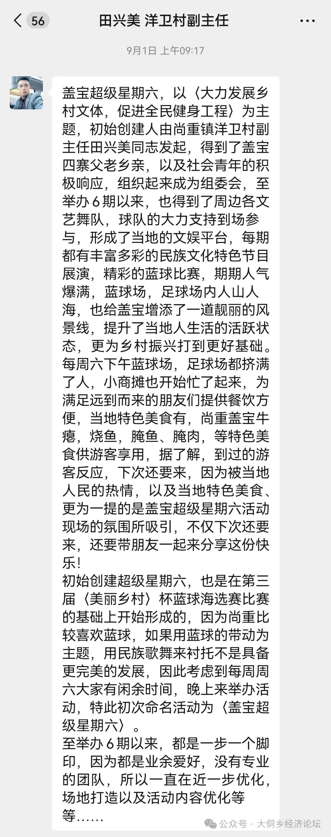 盖宝侗寨超级星期六是在位于盖宝侗寨洋卫村的盖宝侗寨文体广场举办的多元融合展示的大型文体活动,2024年7月27日星期六举办第一期,发起人是洋卫村副主任田兴美。