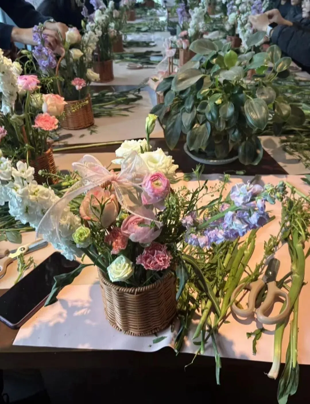 实操环节中,大家兴致盎然动手创作,修剪、搭配、造型一丝不苟。花艺老师现场巡回指导,工作人员及时补给物料,为大家的创作保驾护航。普通花材在巧手下变成错落有致的花艺作品,每一束都藏着独有的巧思。