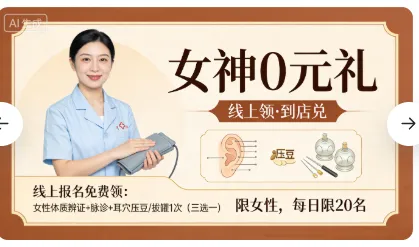 线上报名免费领:女性体质辨证+脉诊+耳穴压豆/拔罐1次(三选一),限女性,每日限20名。