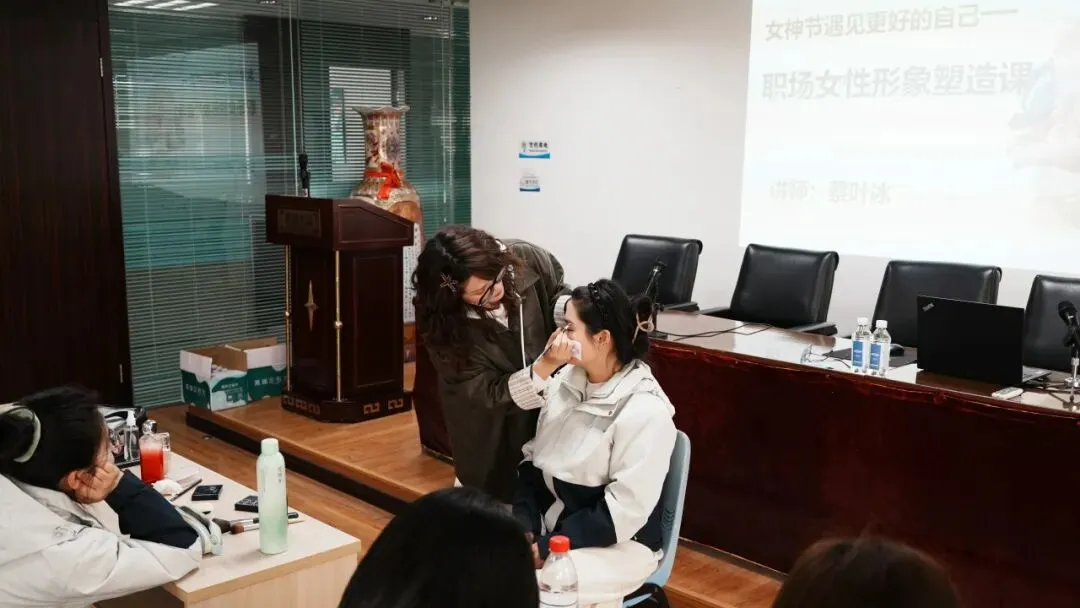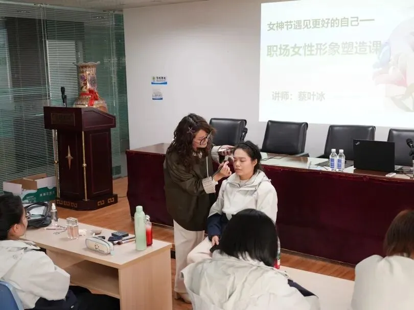 活动现场温馨雅致,鲜花与节日标语营造出浓厚氛围,让女员工们感受到满满仪式感。公司特别邀请化妆老师,结合每位员工的脸型、肤色与气质,量身打造贴合职场气质的精致妆容,同时现场讲解职场化妆、补妆及护肤技巧,帮助大家解锁美妆秘诀,绽放独特魅力。