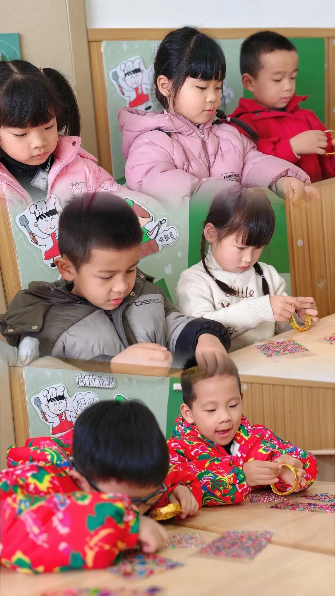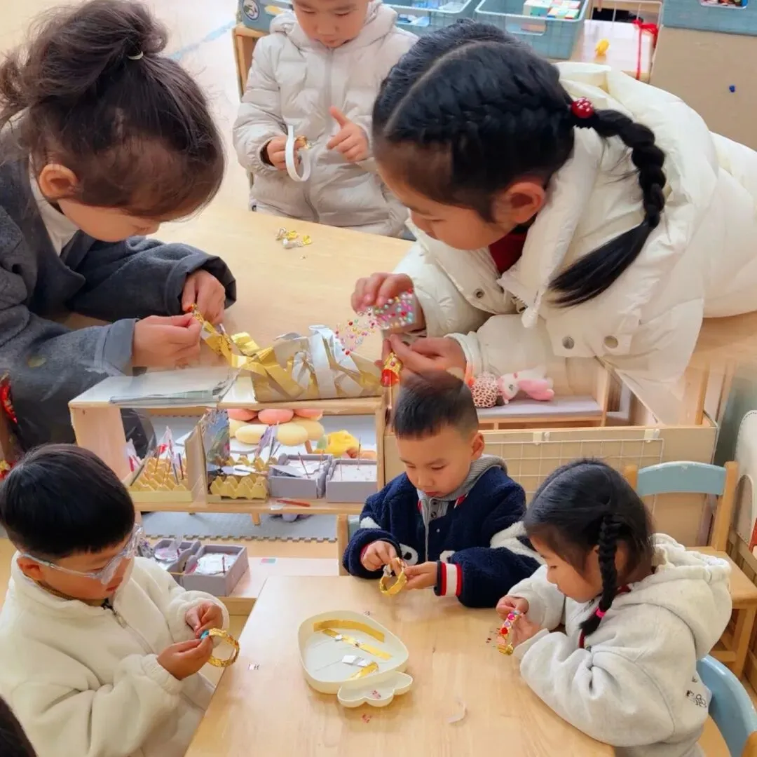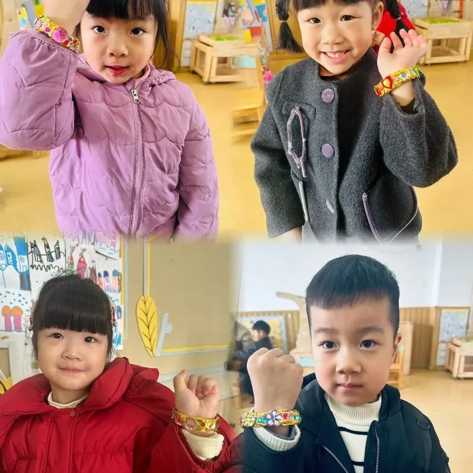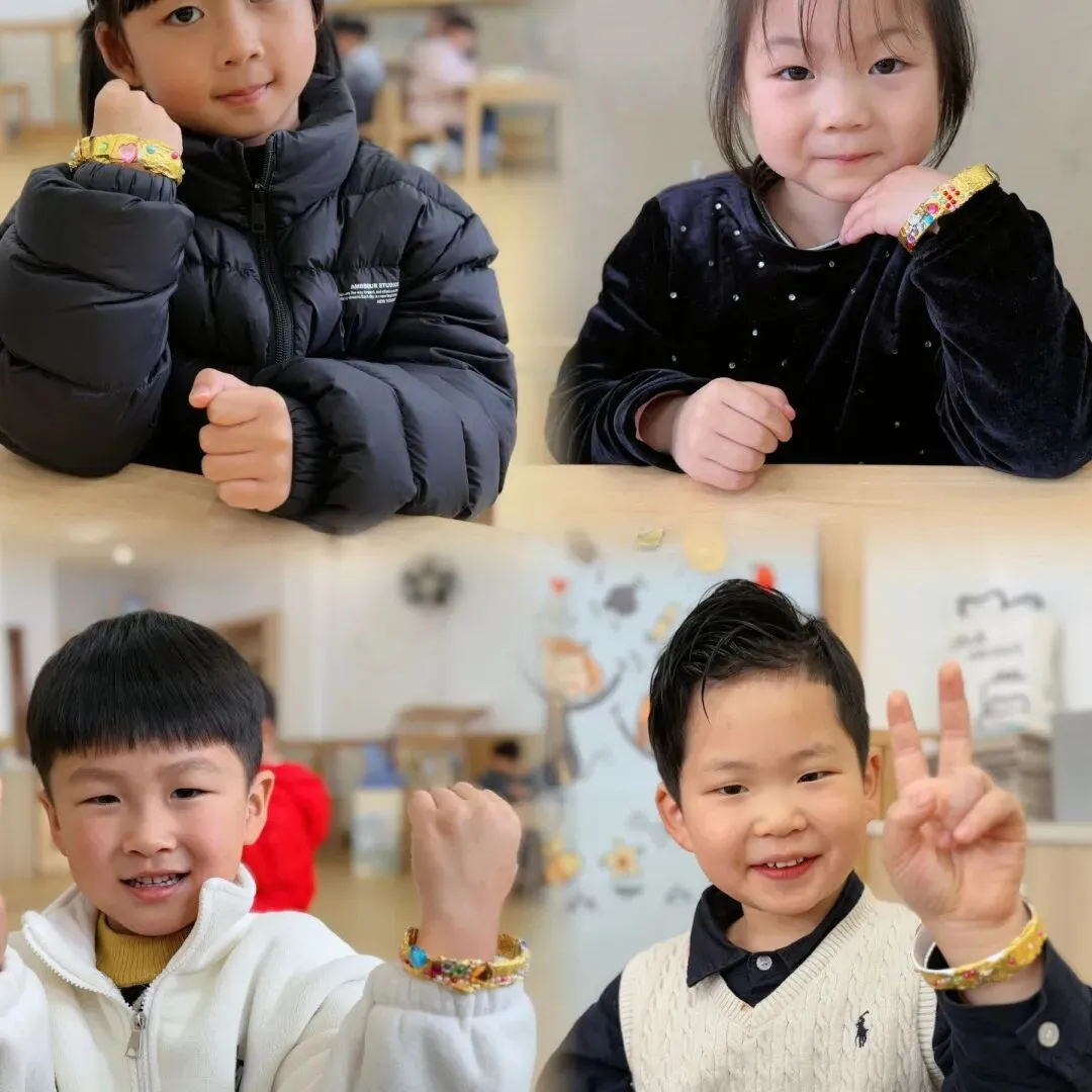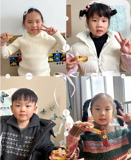 孩子们在老师的指导下,用双面胶和金箔纸制作金灿灿的黄镯子。当普通的材料在孩子们手中变成闪耀的手镯时,他们的脸上洋溢着自豪的笑容。“这个镯子要送给奶奶,她戴上一定很漂亮!”通过制作活动,孩子们不仅锻炼了动手能力,更懂得了感恩身边每一位辛勤付出的女性长辈。
