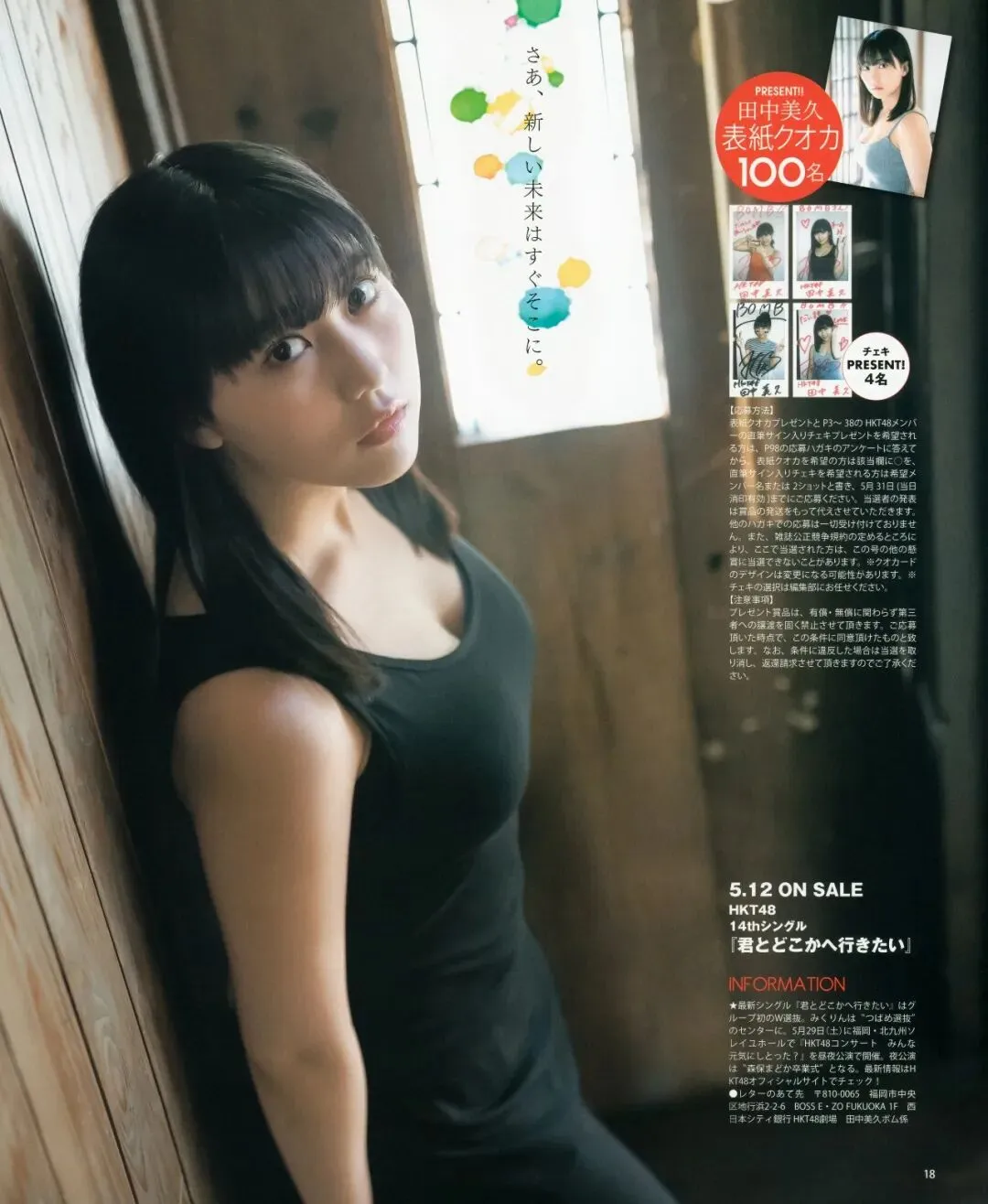 田中美久(Tanaka Miku) 是日本知名偶像组合 HKT48 的成员,以甜美的外貌和开朗的性格著称,是团队中的核心成员之一。她从小就展现了对表演的热情,并凭借多年的努力成为偶像界备受瞩目的明星。主要经历加入HKT48田中美久于2013年加入HKT48的三期生,凭借天真无邪的形象迅速吸引了大量粉丝。她与同期成员矢吹奈子组成了“奈子美久”组合,成为团队的标志性二人组之一。音乐与表演活动作为HKT48的核心成员,田中美久多次担任单曲选拔成员,并参与了许多重要活动。她的舞台表现力和甜美嗓音使她在团队中备受推崇。除了偶像活动,她还参演过电视剧、舞台剧等作品,展现了作为演员的潜力。写真集发布凭借出色的外貌和镜头表现力,田中美久陆续推出了多本写真集。其中,写真作品多以清新、可爱和青春气息为主,也展现了她逐渐成熟的一面。个人成长在HKT48的成长中,她从一个甜美的小偶像蜕变为具备独立魅力的年轻女性,不断挑战自我,在写真、表演和综艺等多个领域崭露头角。个人魅力甜美外貌:田中美久拥有柔和的五官和天真的笑容,被称为“治愈系偶像”。开朗性格:她活泼开朗的性格和亲和力,使她在团队中人气极高。多才多艺:无论是舞台表演还是写真拍摄,她都能展现出极强的表现力。
