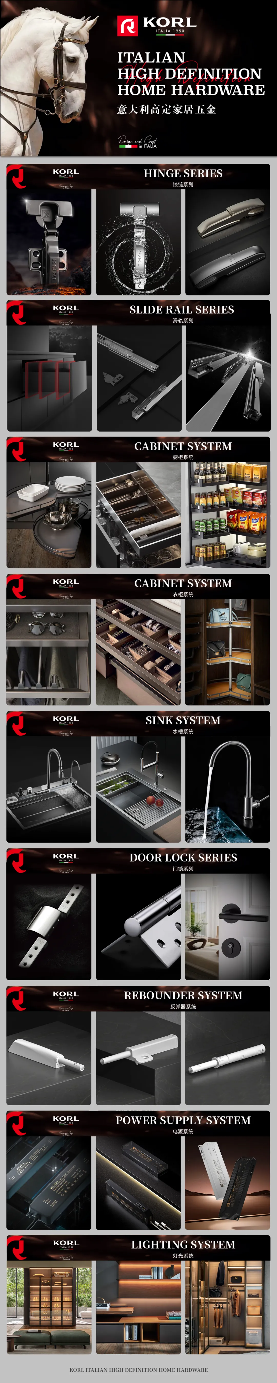 因为KORL的每一个构件,都在追求一种极致——顺滑静音,始终如一。当门缓缓关闭,没有声响;当抽屉轻轻推入,没有滞涩;当把手被握住的瞬间,那种恰到好处的重量与温度,是一种无声的承诺:秩序,是高级的自由。