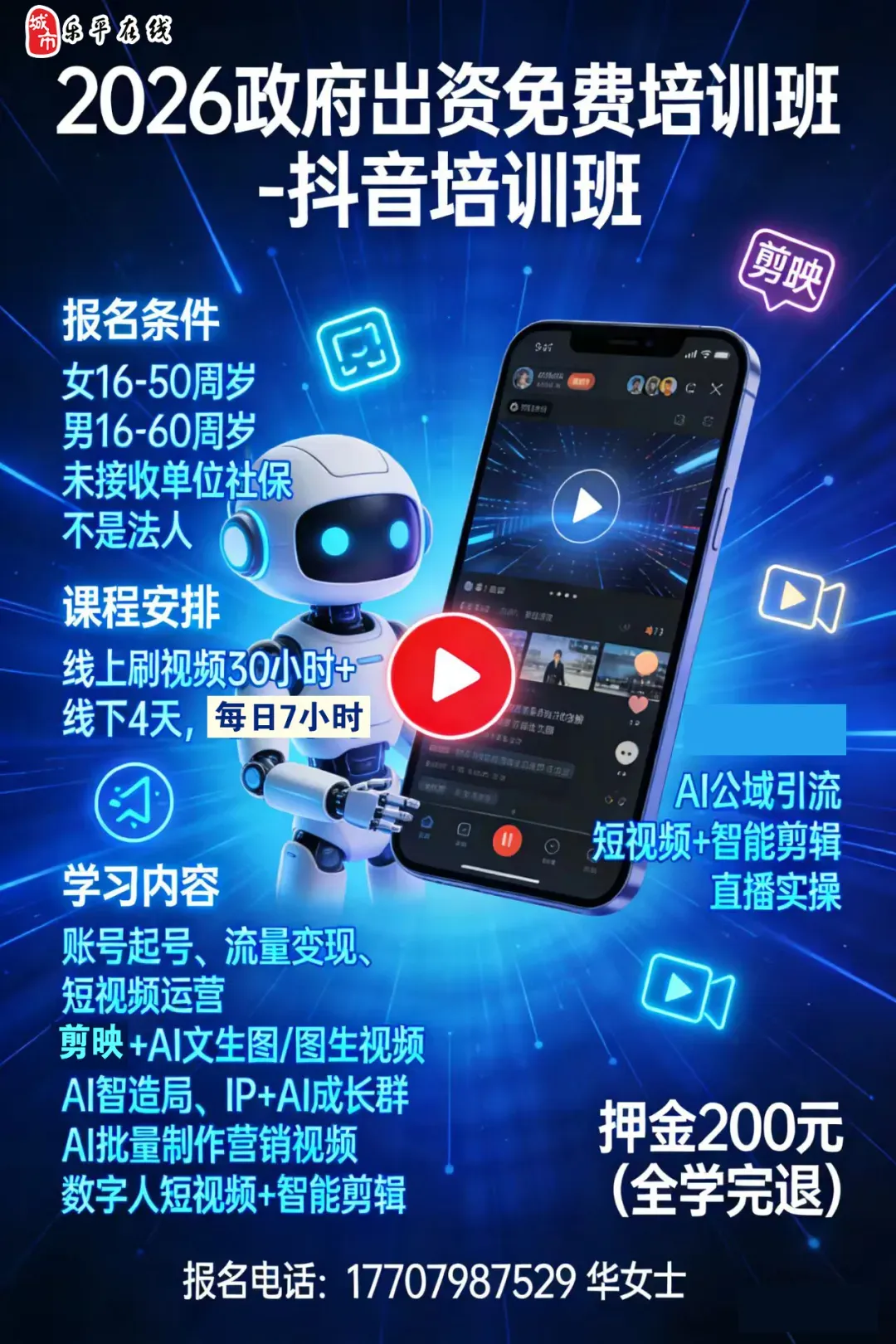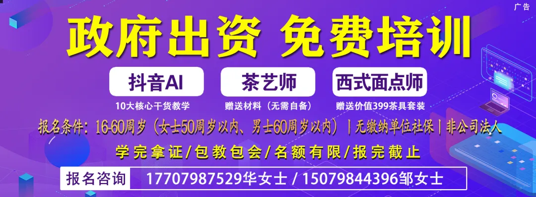 职位描述:2026政府出资免费培训班抖音培训班要符合条件1.年龄:* 16-50周岁 * 16-60周岁2.未缴纳单位社保,不是法人3.上课课程安排:线上刷视频30小时+线下4天(下午+晚上)一天7小时学习内容:AI赋能直播电商——1)账号0-1如何起号2)抖音流量变现3)抖音短视频如何运营4)剪映 (deepseek+ai)文生图,图生视频 制作 5)AI智造局6)IP➕AI超级个体成长群7)如何运用**AI工具批量制作营销短视频8)如何用AI实现公域精准引流客户 9)AI黑科技:数字人短视频+智能剪辑,10)直播+实操押金200元,线下线上课程上..17707987529华女士/15079844396邹女士.