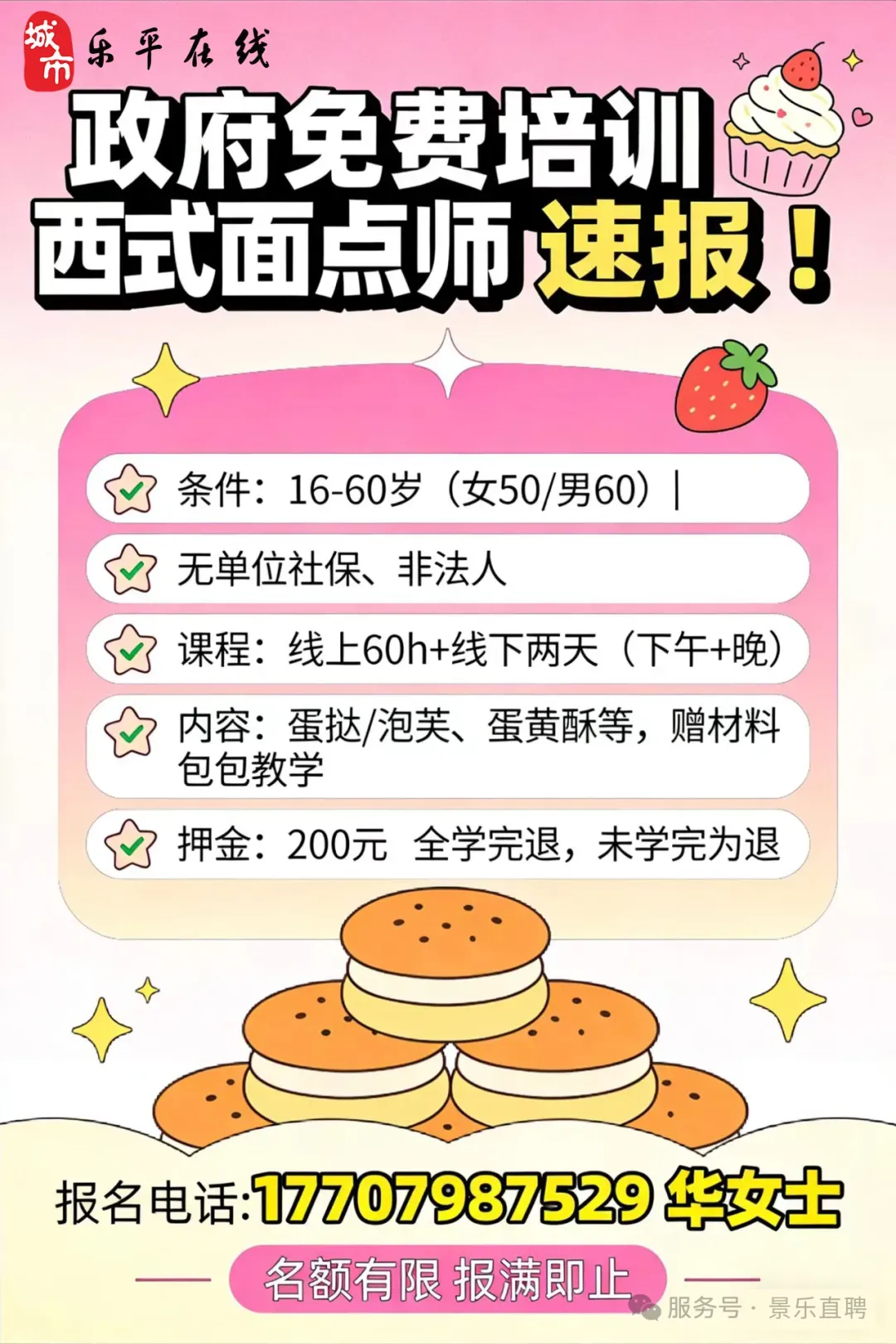 职位描述:2026政府出资免费培训班 免费培训:西式面点师 名额有限 赶紧来报名 要符合条件 1.年龄:* 16-50周岁 * 16-60周岁 2.未缴纳单位社保,不是法人 3.上课课程安排:线上刷视频60小时+线下2天(下午+晚上)一天5、6小时 学习内容:甜品蛋糕培训班 蛋挞,泡芙,肉松小贝,蛋黄酥,雪媚娘,千层蛋糕等,包教包会(赠送学习材料包) 押金200元,线下线上课程上完全额退,课程没上完,不退押金;