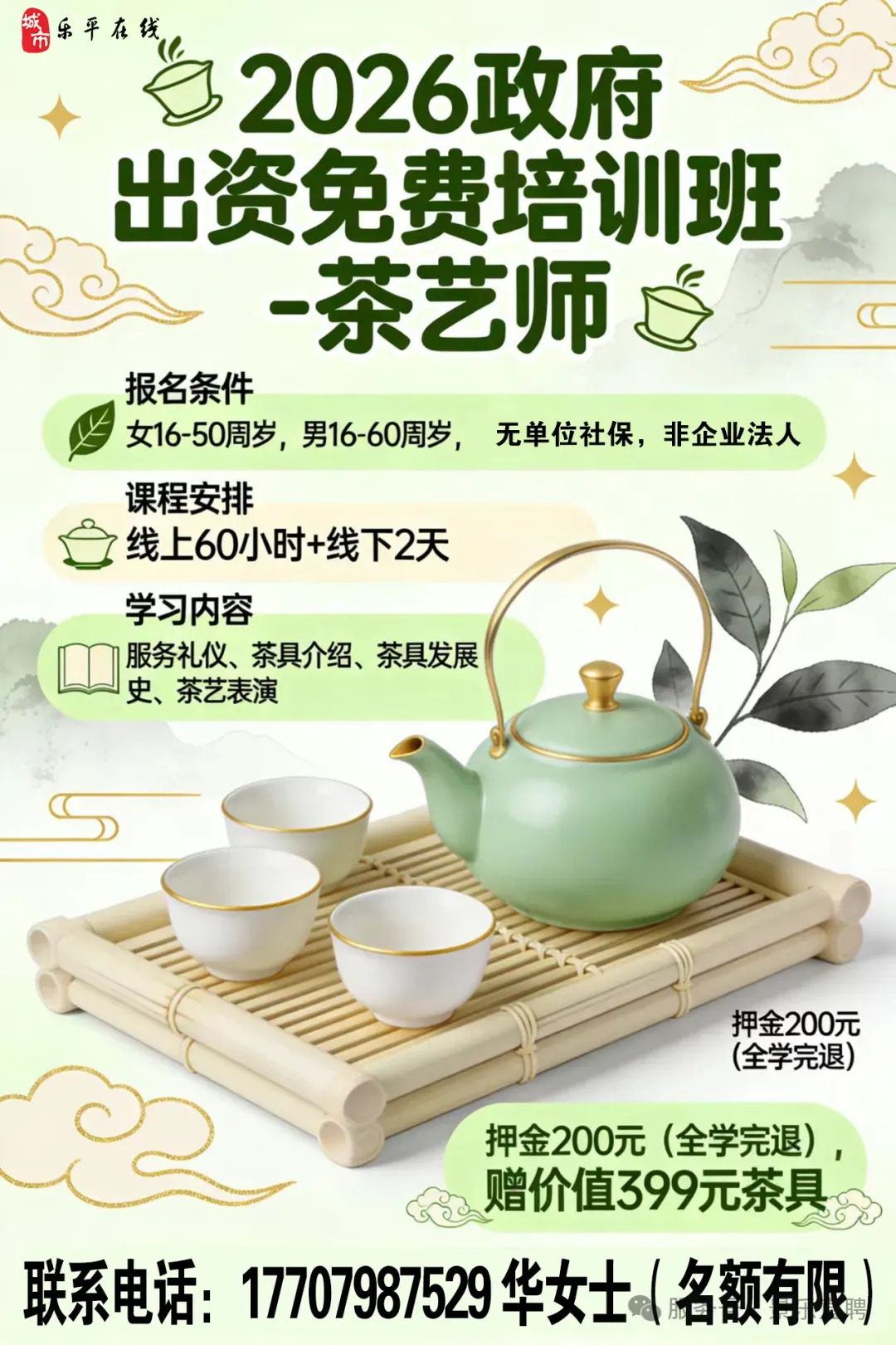 职位描述:2026政府出资免费培训班 免费培训 茶艺师 名额有限,赶紧报名! 要符合条件 1.年龄:* 16-50周岁 * 16-60周岁 2.未缴纳单位社保,不是法人 3.课程安排:线上60小时+线下2天(下午+晚上)一天5、6小时 学习内容: 1)服务礼仪基本知识 2)茶具介绍 3)茶具发展史品茗用 4)茶艺表演茶文化,茶礼仪 押金200元,线下线上课程上完全额退,课程没上完,不退押金; 茶艺师,上完还赠一套茶具价值399元;